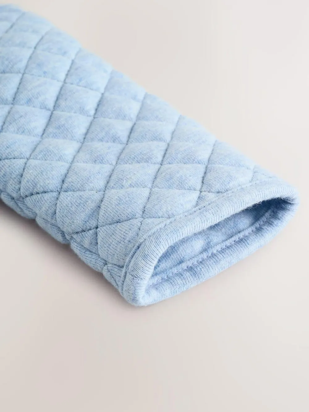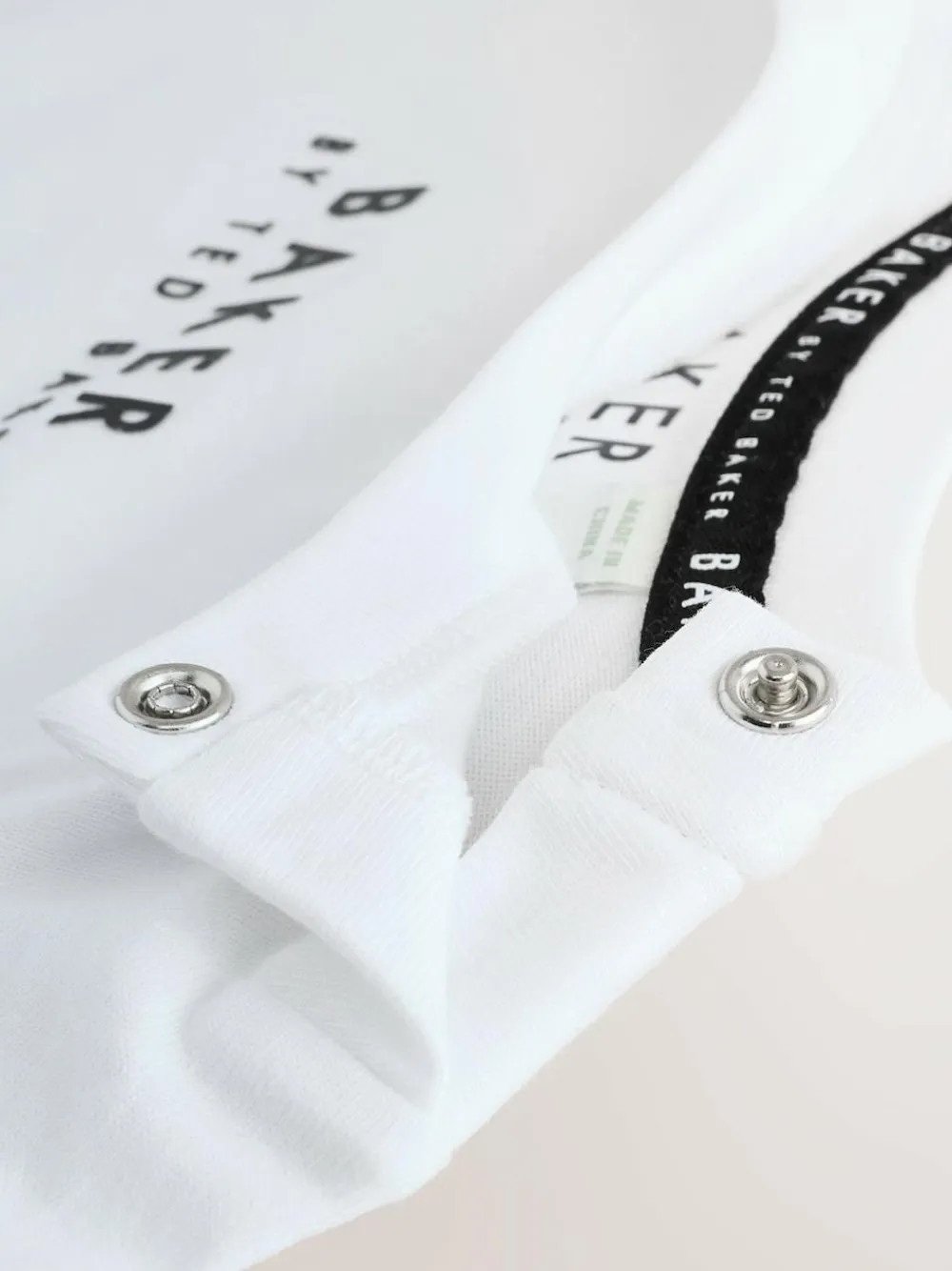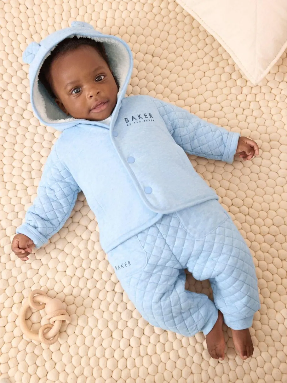 Dress your little one in cosy comfort with the Baker by Ted Baker Quilted Jacket, T-Shirt and Trousers Set. This adorable blue quilted 3-piece set is perfect for cooler days. The quilted jacket features a snuggly borg-lined hood with playful ears and subtle BAKER branding. It’s paired with a simple branded t-shirt and matching blue quilted trousers to complete the coordinated look. 3 piece set Quilted design Baker branding Ears on hood Jacket Main 100% Cotton. Lining 100% Cotton. Artificial Fur 100% Polyester. Wadding 100% Polyester. T-shirt 100% Cotton. Jogger Main 100% Cotton. Lining 100% Cotton. Wadding 100% Polyester.