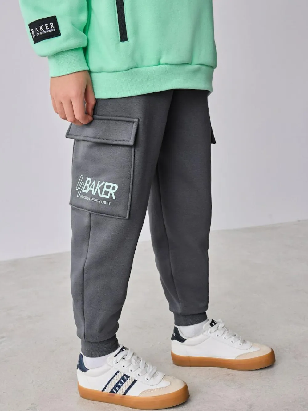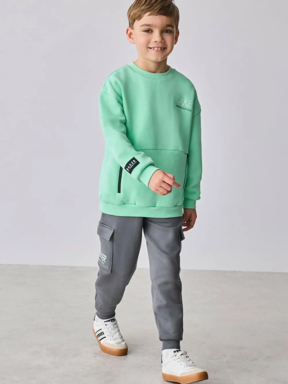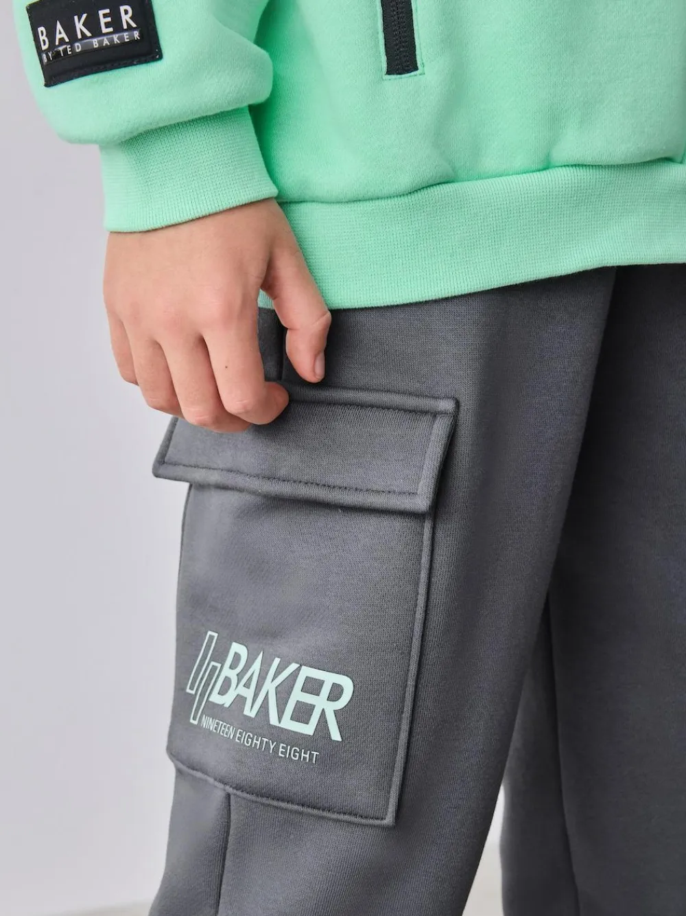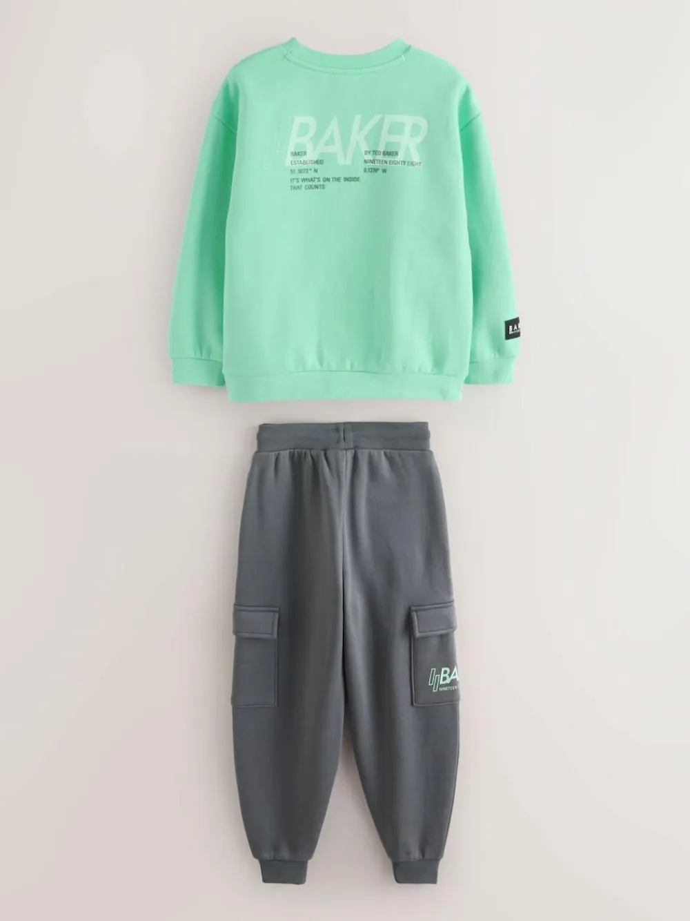 Upgrade their off-duty wardrobe with the Baker by Ted Baker Sweatshirt and Cargo Joggers Set, a premium two-piece that combines a modern silhouette with functional street-style details. This set features a classic sweatshirt designed with bold graphic branding across both the front and back. Practicality meets style with branded zip puller pocket details integrated into the front of the sweatshirt. Completing the set are the contrasting cargo joggers, which feature spacious cargo pockets on each leg and distinctive graphic branding on the cargo pocket. The joggers are completed with an elasticated waistband featuring branded drawcords and eyelets. 2 piece set Graphic branding Branded zip puller pockets Sweater and Jogger Main 82% Cotton, 18% Polyester. Rib 99% Cotton, 1% Elastane.