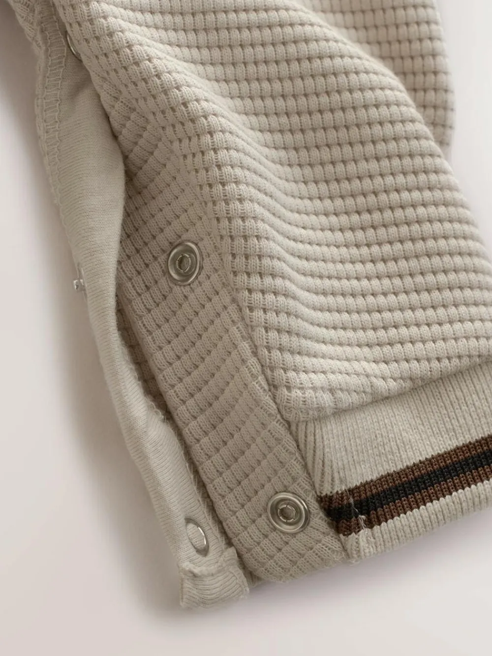 Dress your little one in cosy style with the Baker by Ted Baker Textured Long Sleeve Romper. This adorable romper features a soft, all-over textured waffle knit. It boasts bold BAKER branding on the chest and is designed with branded snap buttons for easy changes. The contrasting trim on the cuffs adds a smart finish to this comfortable long-sleeve outfit. Baker branding Long sleeve Textured fabric 90% Cotton, 8% Recycled polyester, 2% Elastane.