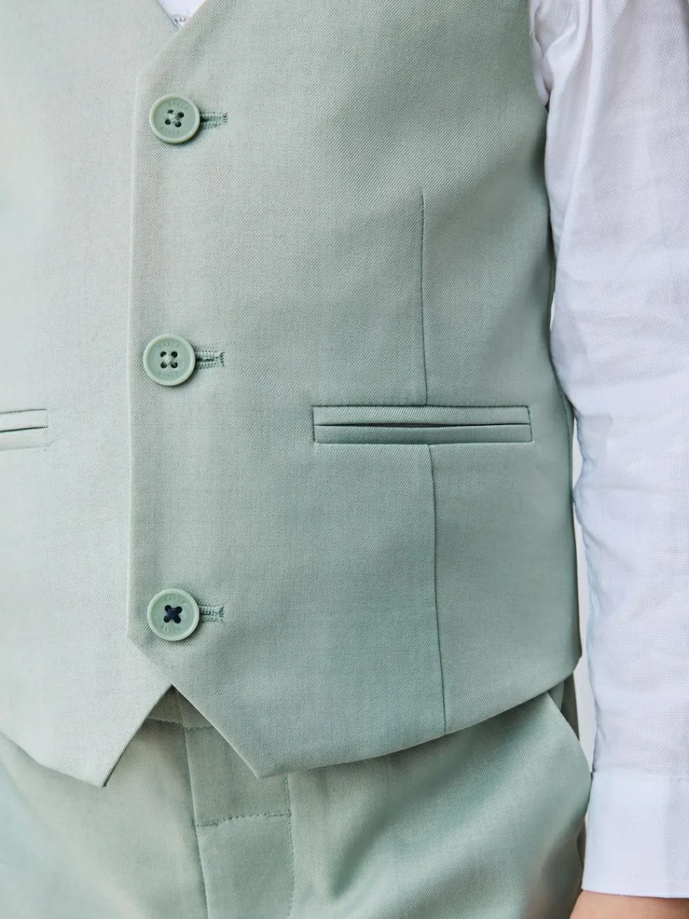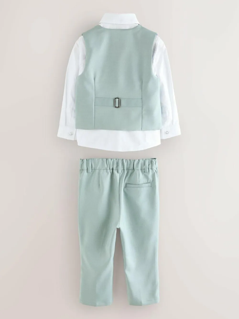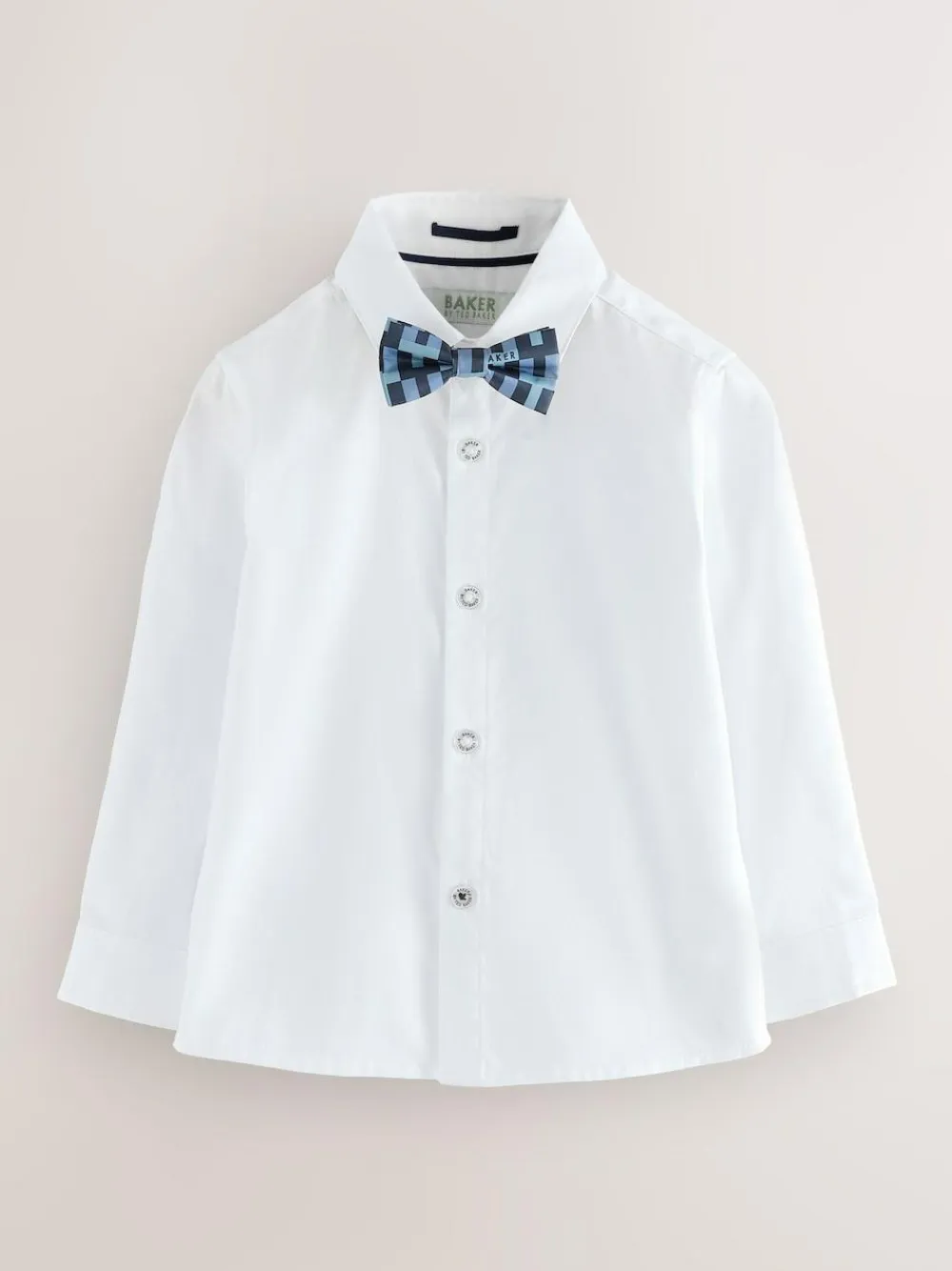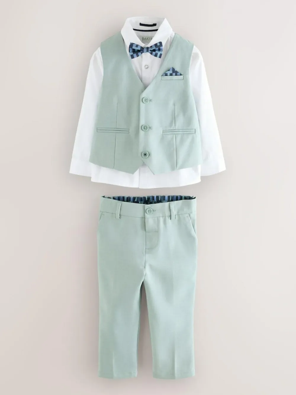 Dress up your little man in style with this adorable outfit from Baker by Ted Baker. The three-piece set is perfect for all of his special occasions and includes a waistcoat, trousers and they come with a classic white sleeve shirt The waistcoat has false pockets and branded button fastenings down the front. The trousers have a traditional button and elasticated waist for a comfortable fit. The whole look is finished with a printed cute bow tie and pocket sqaure. Add some smart shoes and he will be the best-dressed guest. Shirt 100% Cotton. Waistcoat Main 98% Polyester, 2% Elastane. Lining 100% Polyester. Trouser 98% Polyester, 2% Elastane. Bow Tie 100% Polyester.