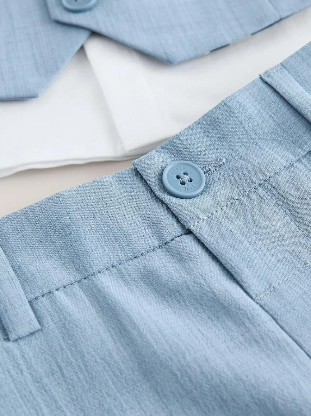 Dress up your little man in style with this adorable outfit from Baker by Ted Baker. The three-piece set is perfect for all of his special occasions and includes a waistcoat, trousers and they come with a classic white sleeve shirt The waistcoat has false pockets and branded button fastenings down the front. The trousers have a traditional button and elasticated waist for a comfortable fit. The whole look is finished with a printed cute bow tie and pocket sqaure. Add some smart shoes and he will be the best-dressed guest. Shirt 100% Cotton. Waistcoat Main 100% Polyester. Lining 100% Polyester. Trouser and Bow Tie 100% Polyester.