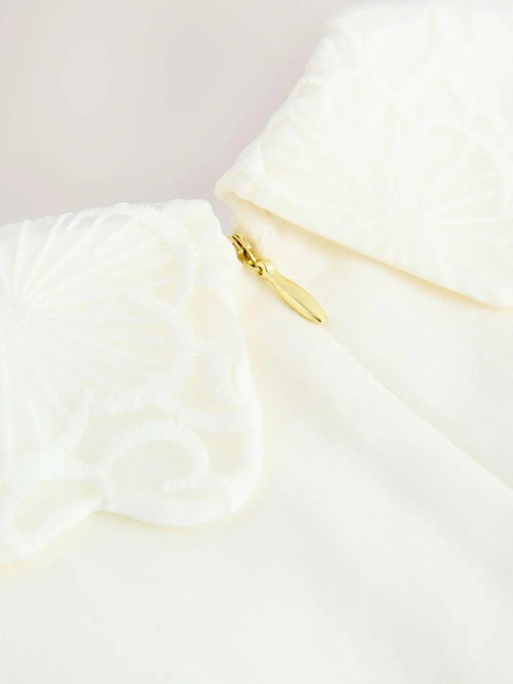 A timeless piece perfect for any cherished event. This exquisite dress is crafted in a soft ponte fabric in a rich cream tone, with a soft structure that ensures a graceful drape. The defining feature is the scalloped collar, intricately detailed with delicate lace embroidery. The dress is finished with our Baker branded gold-tone heart buttons down the bodice. With its gentle A-line cut and sophisticated short sleeves, this dress is designed to be an heirloom piece. 95% Cotton, 5% Elastane.