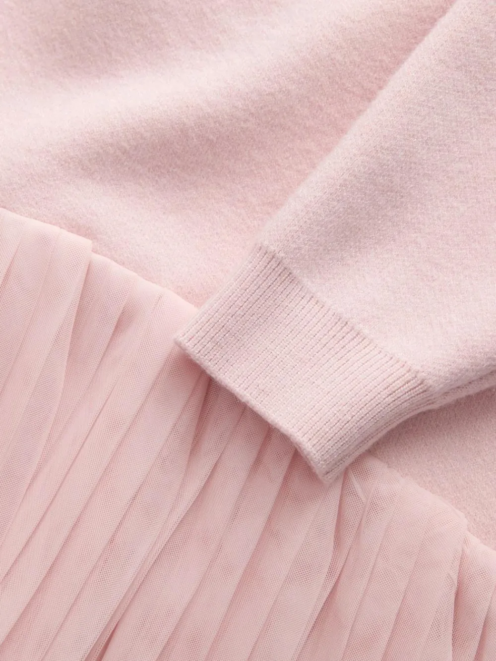 Combine cozy comfort with ballet-inspired charm in this stylish knit dress from Baker by Ted Baker. Perfect for winter days or weekend fun, the dress features a soft, long-sleeved knit sweater top in a gentle baby pink shade. The comfortable bodice flows into a spectacular skirt made of layered, pleated mesh, giving it a beautiful, bouncy volume. This unique combination of casual knitwear and delicate tulle creates a trendy, hybrid silhouette that is both practical and delightfully pretty. The chest features our baker bow embroidery, adding a touch of signature Ted Baker magic. Pair with trainers for a casual cute fit Body 50% Viscose, 28% Polyester, 22% Nylon. Bottom Panel 100% Polyester.