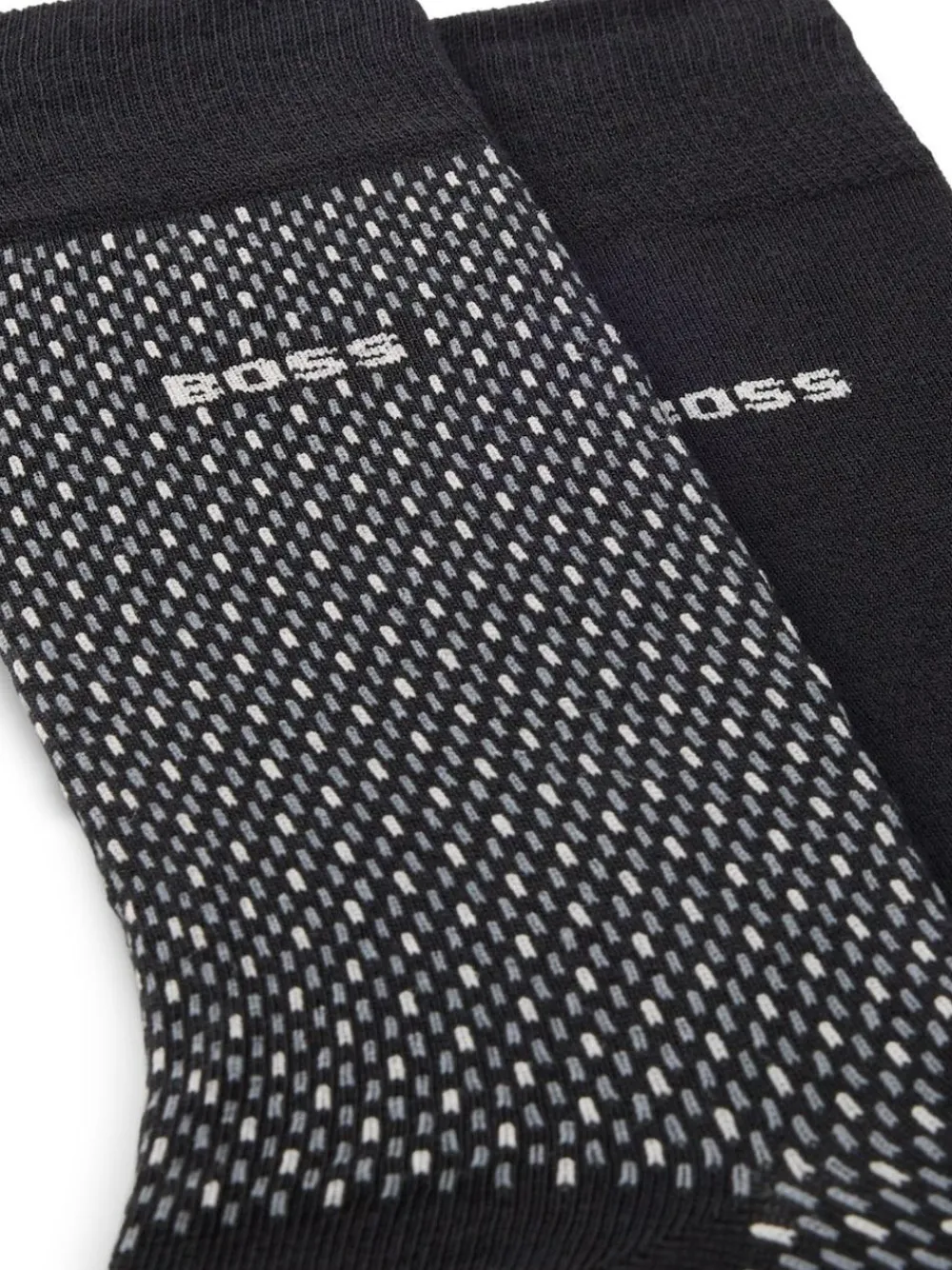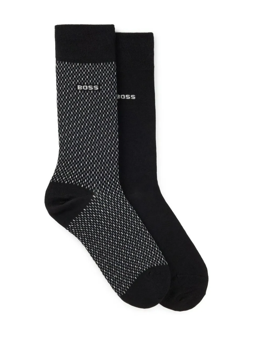 A duo of patterned and plain black socks by BOSS. Featuring a logo detail, each regular-length pair is crafted in a stretch blend with cotton. 52% Nylon, 46% Cotton, 2% Elastane.