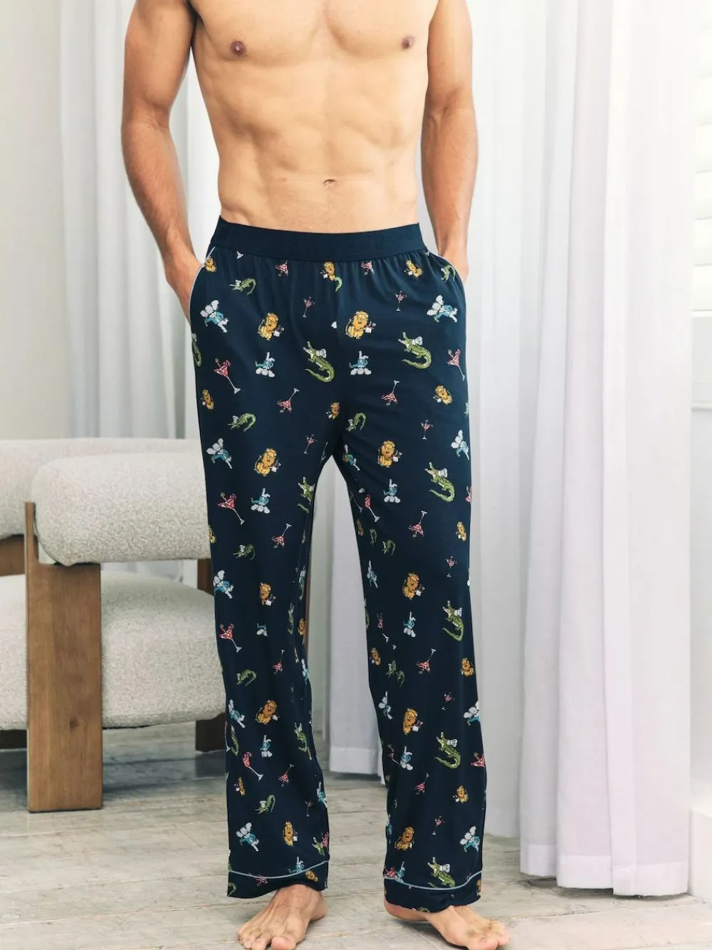 Dinner is officially served – with a side of mischief. These lounge-ready bottoms feature our hand-drawn Wild Dining print, where a crocodile takes charge in the kitchen, an elephant sommelier pours with flair, and a lion waiter brings the charm. Oh, and don’t miss the lobster kicking back in a cocktail glass. These straight let bottoms have an elasticated waist for comfort and side pockets for all your essentials. Whether you’re curling up or cooking up a storm, these pyjamas bring playful energy to your off-duty hours. Machine washable. 95% Polyester, 5% Elastane. Warning: Keep away from fire and flames.