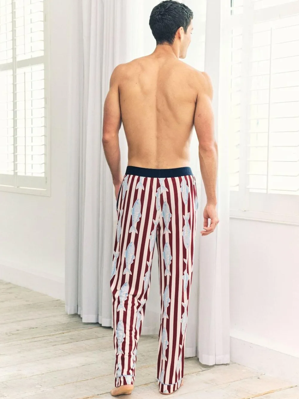 These soft jersey pyjama bottoms are the catch of the day. Covered in a hand-drawn school of blue fish swimming across dark red and cream stripes, they’re a playful nod to slower days and sofa-bound evenings. Cut from fibre jersey with an elasticated waist and side pockets, they’re made for unwinding, whether you’re fresh off the riverbank or just fishing for comfort at home. Gone fishing, be home for lounging. Machine washable. 95% Polyester, 5% Elastane.