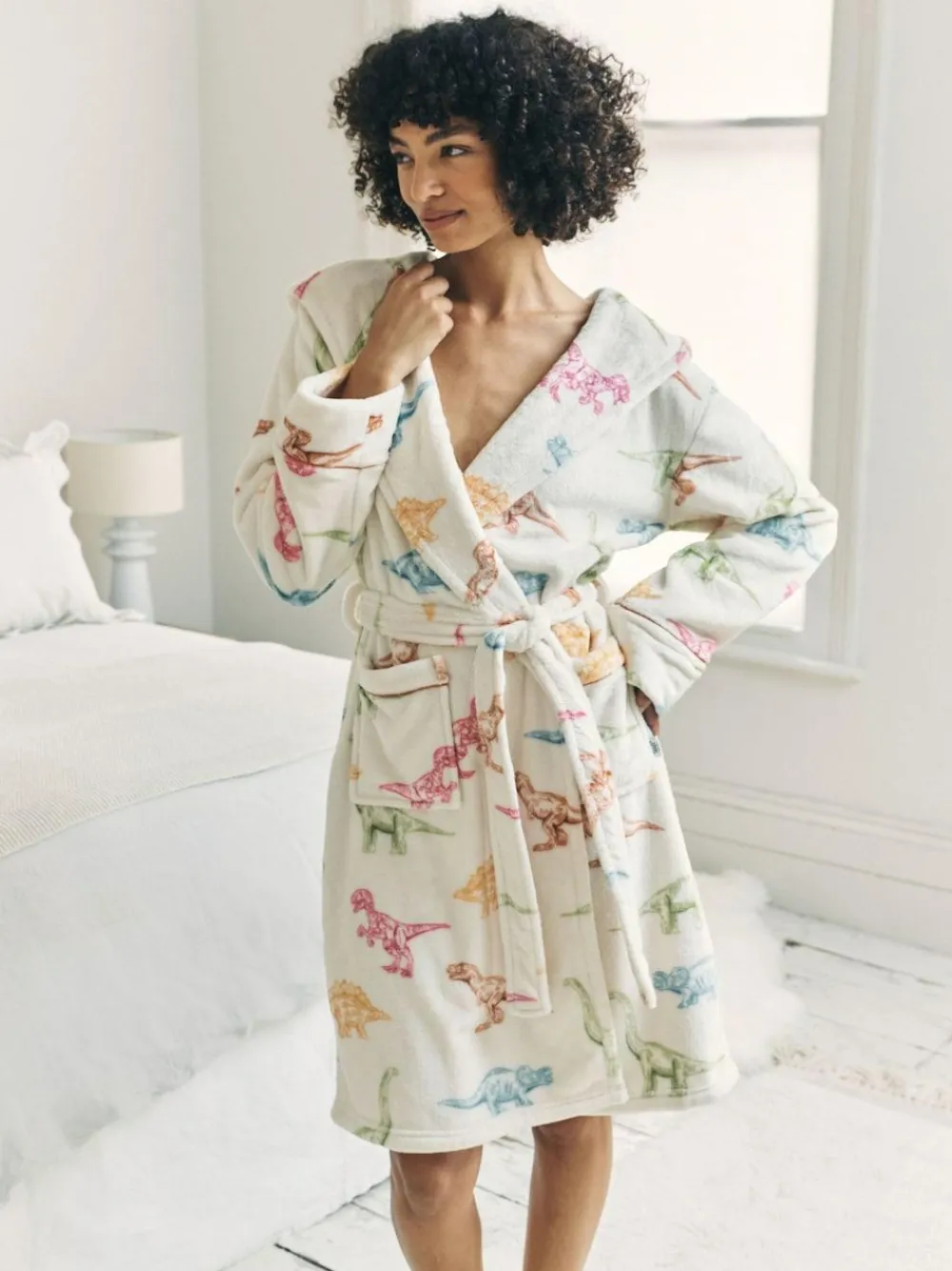 Calling all dinosaur lovers. From T. rex to Triceratops, our hand-drawn dinosaur print brings a Jurassic twist to cosy nights in. Brightly coloured dinos march across a cream backdrop, making this robe as fun as it is functional. It s designed with a hood, self-tie belt and handy patch pockets for everyday comfort. Perfect for wrapping up after a bath or lounging before bedtime. Roarsome comfort for dino days and cosy nights. Machine washable. 100% Polyester.