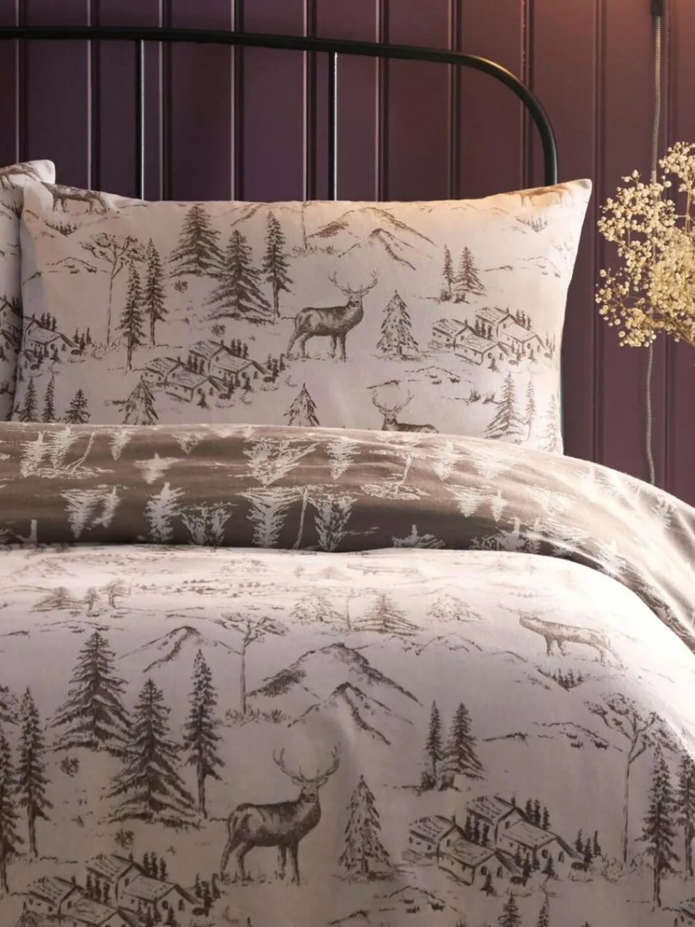 As the chill of winter settles in, embrace the comforting elegance of the Alpine Stag Duvet Cover Set. Our hand-drawn design transports you to a serene world of snowy mountains, tranquil Alpine lodges, and majestic stags, all delicately rendered on a natural-colored base. This enchanting scene invites you to find solace and warmth. Turn down the duvet to reveal the same captivating print on a deeper, darker base, offering a rich contrast that enhances the cosy allure of winter nights. Crafted from 100% brushed cotton, this luxurious set is designed to cradle you in softness, ensuring you are winter-ready and nestled in supreme comfort. Machine washable. 100% Cotton