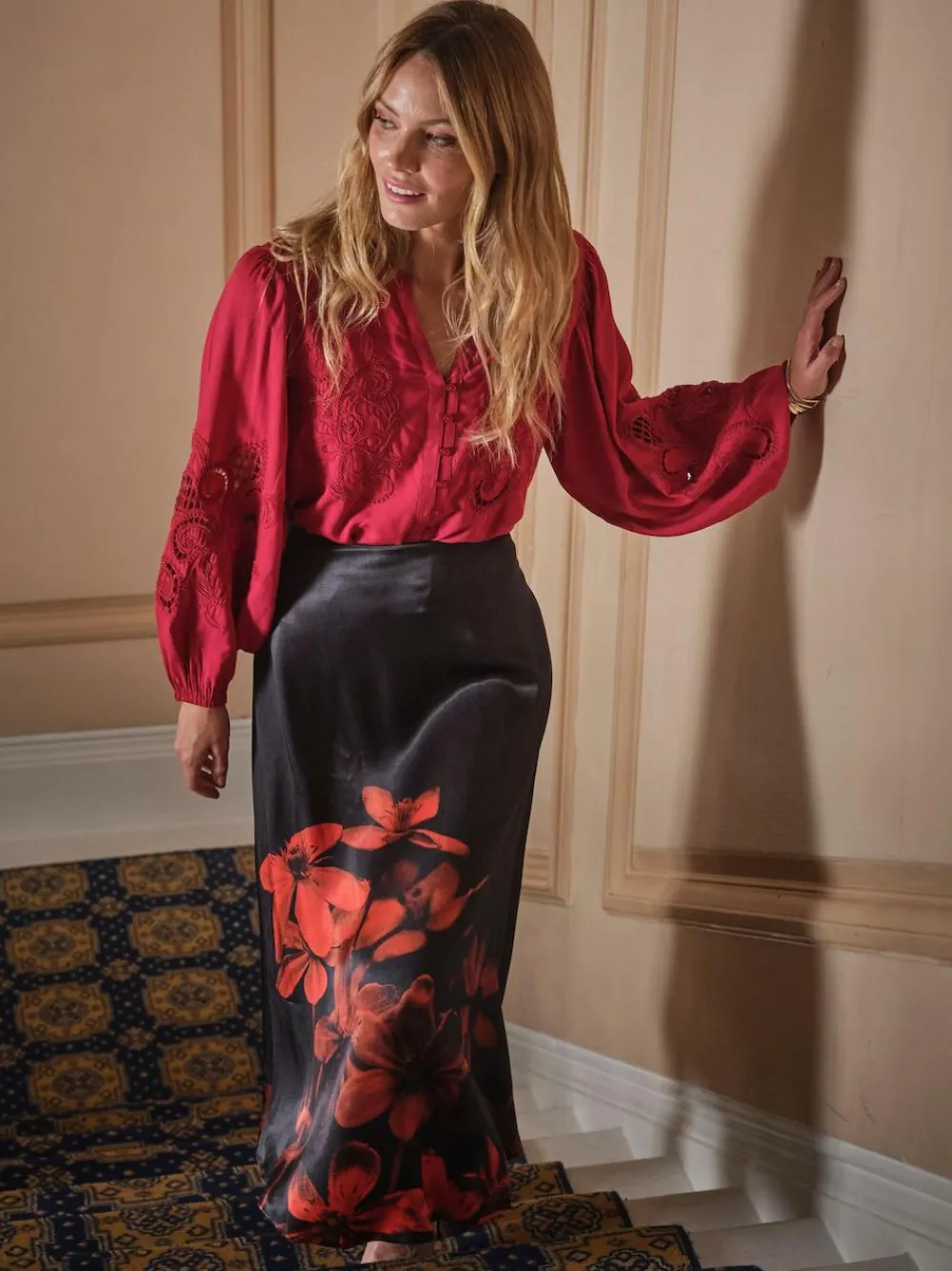 Our Joelle midi skirt is designed to turn heads. Crafted from a soft, breathable fabric blend that sits beautifully, this gorgeous silhouette features a body skimming shape and a side zip fastening for a refined yet confident finish. It features a gorgeous placement floral print with a luxurious heavy draped fabric with a sheen to it. Effortlessly graceful, the Joelle is made for moments that call for elevated ease and understated glamour. Regular waistband to hem 34″ / 86cm. Machine washable. 56% LENZING™ ECOVERO™ Viscose, 44% Viscose.