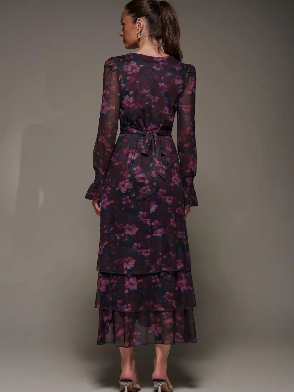 Long Sleeve Ruffle Hem Mesh Maxi Dress by Jolie Moi features long sleeves with shirred wrists that naturally flare out. The V-Neckline and wrap-style front enhance the flattering silhouette, while the belt cinches the waist. The three-tiered ruffle hemline is slightly shorter in the front so the dress sways beautifully as you walk. Machine washable. 95% Polyester, 5% Elastane.