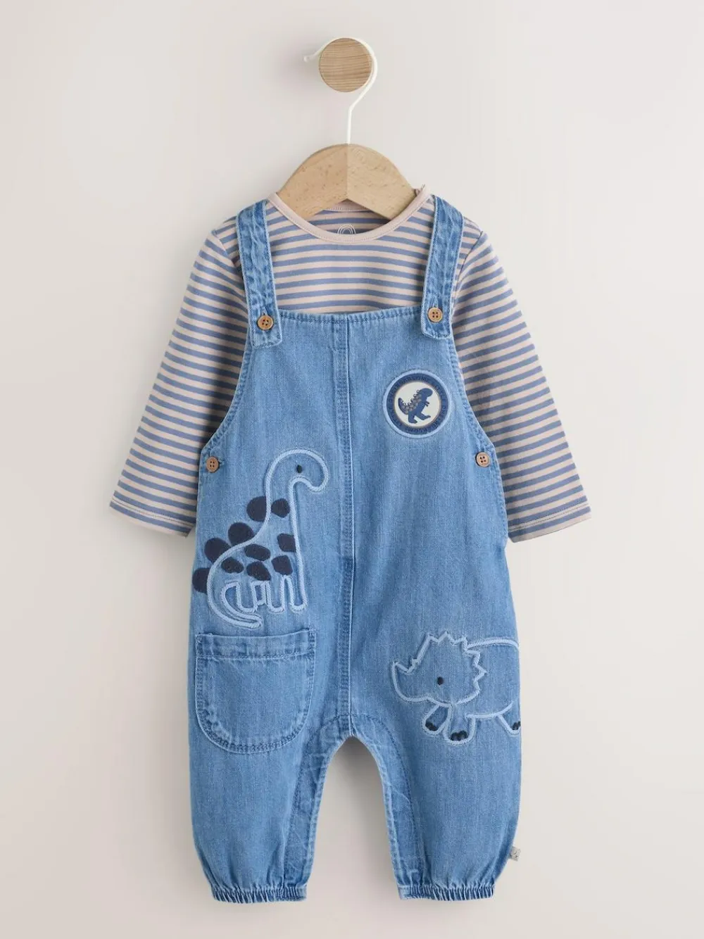 Best Next Baby Denim Dungarees and Bodysuit Set (0mths-2yrs) Blue Dinosaur