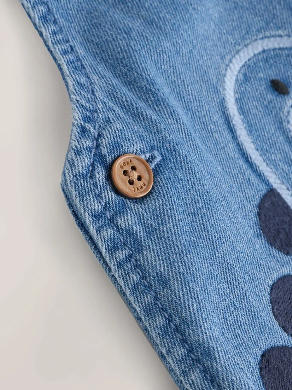 Perfect for playtime, this two-piece set is a stylish and functional outfit. The soft denim dungarees are designed with a stitched, spotted dinosaur and a cute badge. They also come with a kangaroo pocket and adjustable straps, while the striped bodysuit features nickel-free poppers for easy changes. A comfortable and coordinated look for any casual occasion. 2-piece set Denim Adjustable straps Nickel-free poppers Kangaroo pocket Machine washable. Dungaree Main 100% Cotton. Lining 65% Recycled polyester, 35% Cotton. Bodysuit 95% Cotton, 5% Elastane. Warning: Keep away from fire and flames.