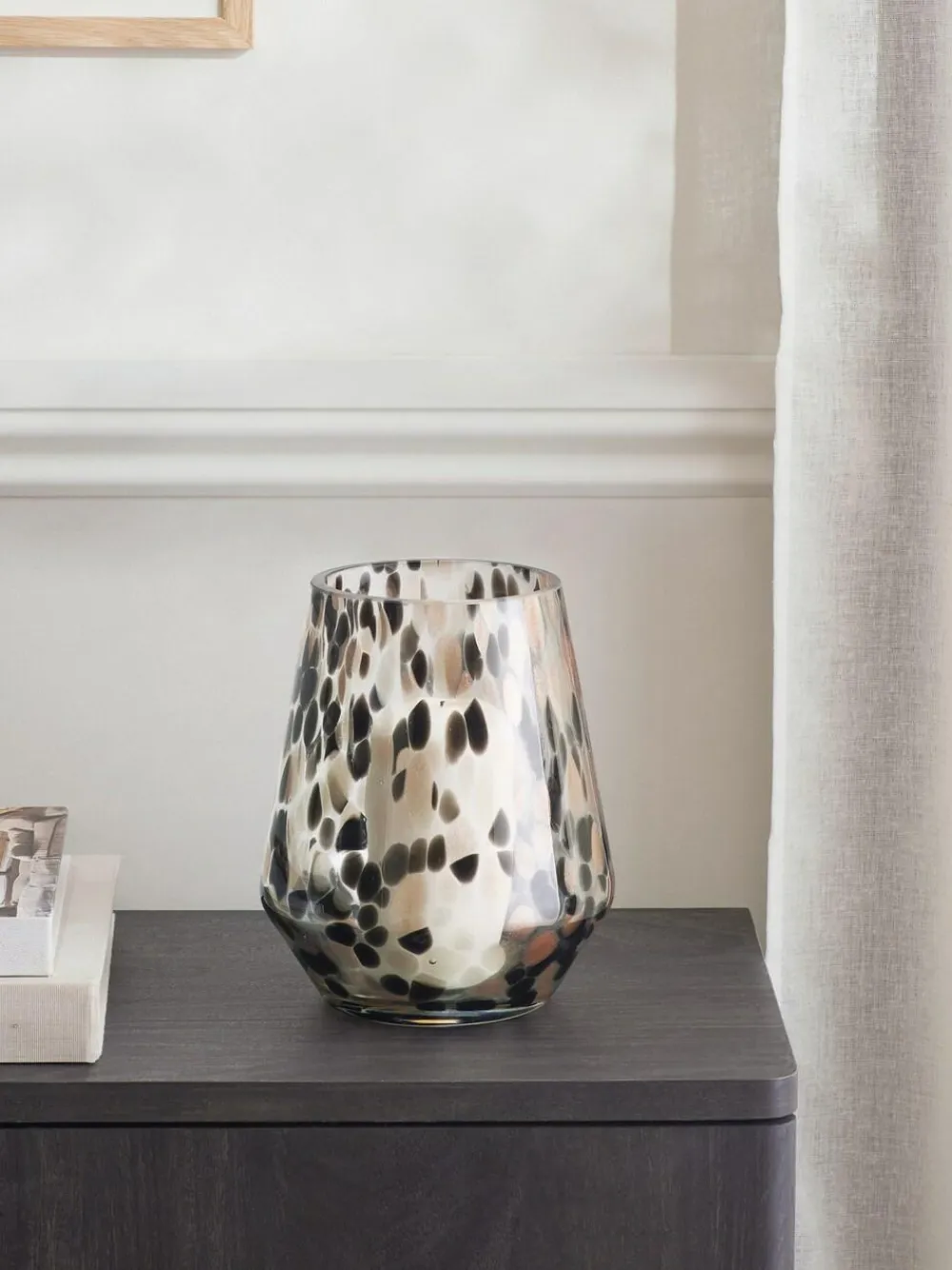 Introducing a dazzling addition to your home décor – the Confetti Glass Hurricane Candle Holder/Vase. With its eye-catching design and versatile functionality, this piece is perfect for adding a touch of glamour and sparkle to any space. The glass is embedded with a playful mix of black and gold confetti-like flecks, creating a mesmerizing shimmer and depth that captures and reflects light beautifully. Use it as a candle holder to create a warm, inviting glow, or as a vase to showcase your favourite flowers or decorative fillers. Its multi-functional design offers endless styling possibilities. Co-ordinating items available. Height 16cm Width 16cm Depth 19.5cm 100% Glass.