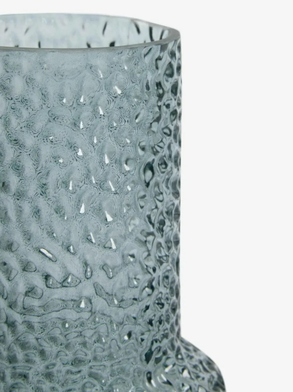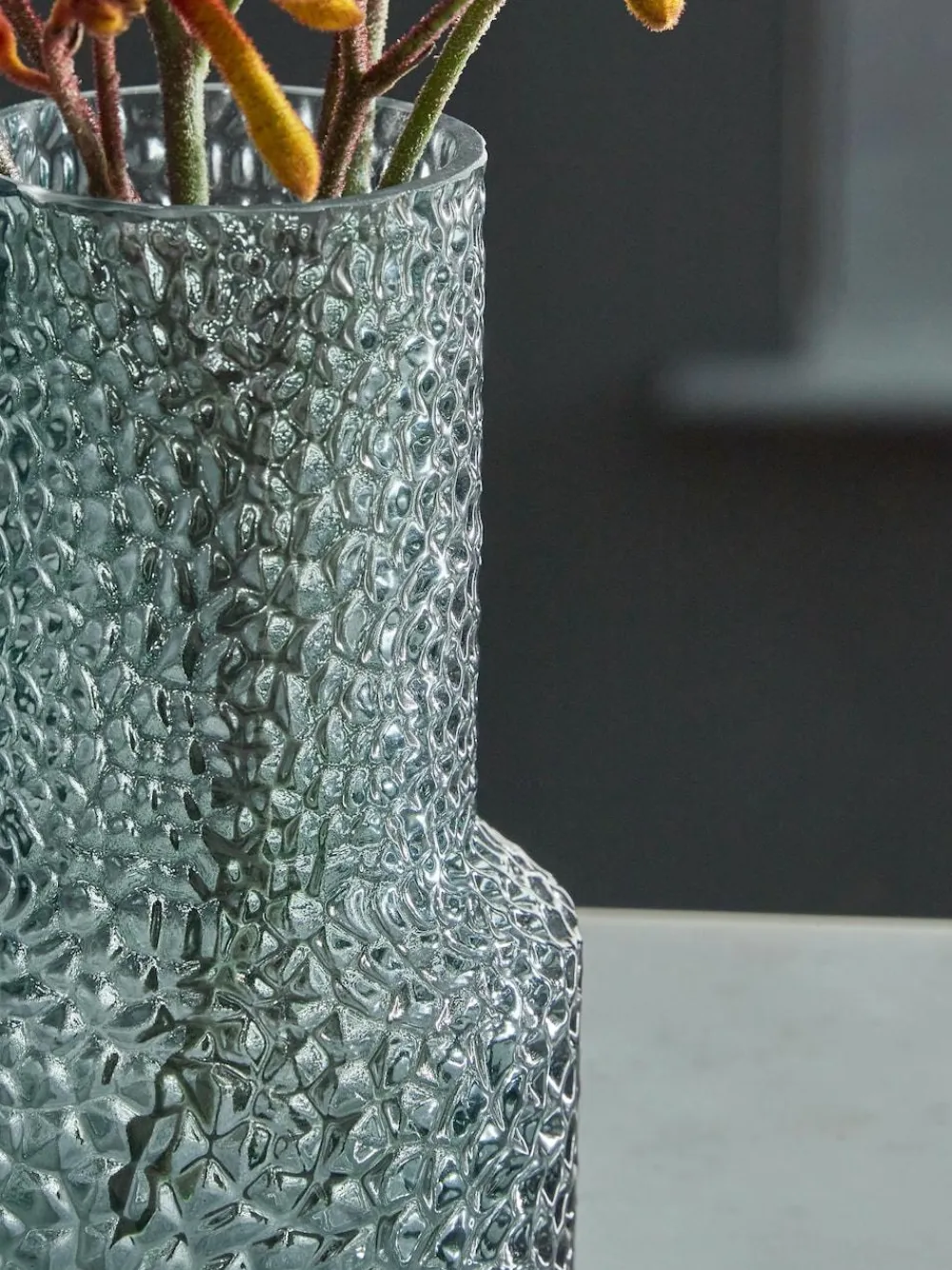 On trend in shape, this glass vase features a subtle texture and blue transparent tint. Can be dressed as a stand alone statement piece, or dressed with fresh or faux flowers on a table or side table in any room. Height 16cm Width 10cm Depth 10cm 100% Glass.