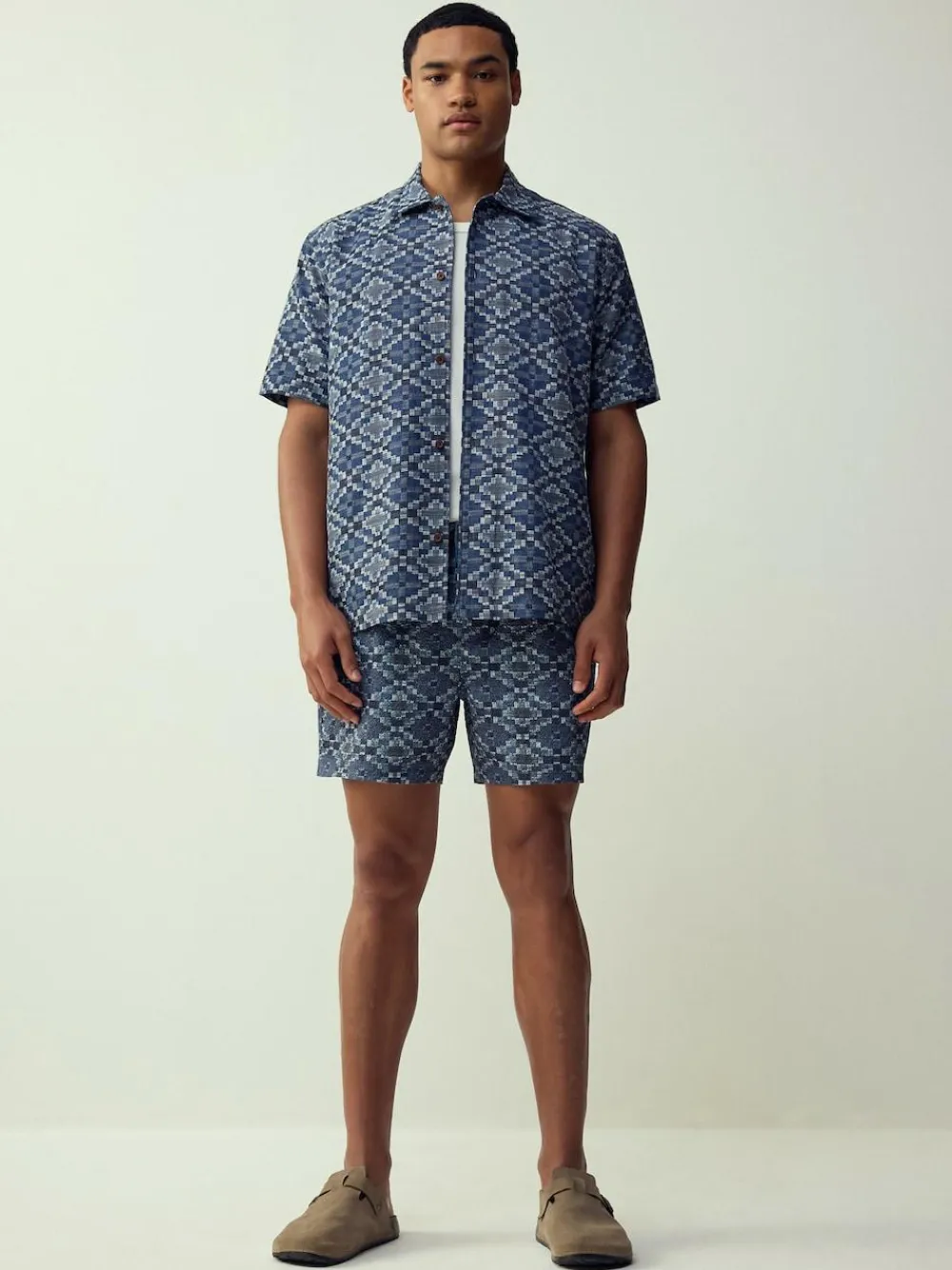 Crafted from 100% cotton in a medium-weight textured fabric, this blue Navajo style shirt offers durability and breathable comfort. The classic revere collar and regular fit make it an ideal addition to your wardrobe. 100% cotton Medium weight textured fabric Regular fit Revere collar Short sleeve Button through fastening Machine washable. 100% Cotton.