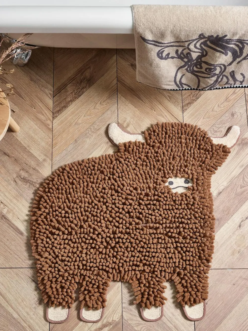 Upgrade your bathroom with our Hamish bath mat inspired by the rugged beauty of the Highland cow. Experience both style and functionality as you step onto this plush mat, bringing warmth and character to your daily routine. Length 70cm Width 66cm Machine washable. 90% Polyester, 10% Cotton.