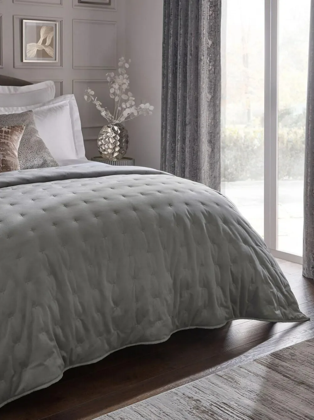 Transform your bedroom into a luxurious sanctuary with this elegant grey Elsie Velvet Quilted Bedspread. This beautifully soft and inviting bedspread features a rich, velvety fabric that drapes beautifully over the bed. Machine washable. Front 100% Recycled polyester. Back 100% Recycled polyester. Wadding 100% Recycled polyester. Throws are not fire retardant and should not be used as loose covers for upholstery.