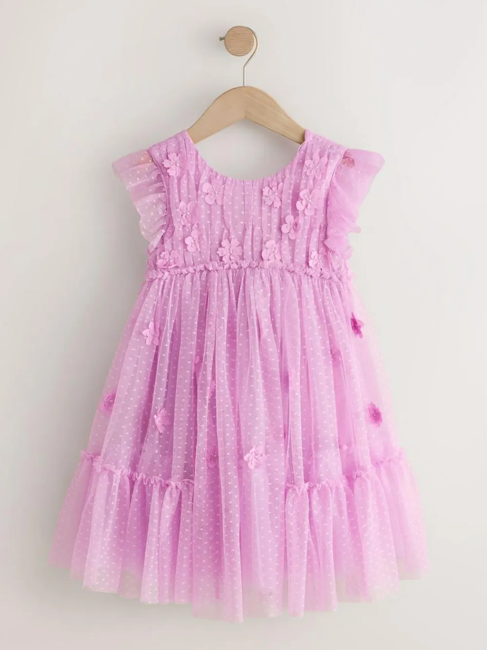 This gorgeous Lilac flower girl dress has a tiered mesh construction with 3D flower detailing, a floaty shape and a comfortable cotton lining, finished with frilled short sleeves. Regular fit Mesh construction 3D flower detailing Floaty shape Frilled short sleeves Cotton lining Main 100% Recycled polyester. Mesh 100% Nylon. Main Lining 100% Cotton.