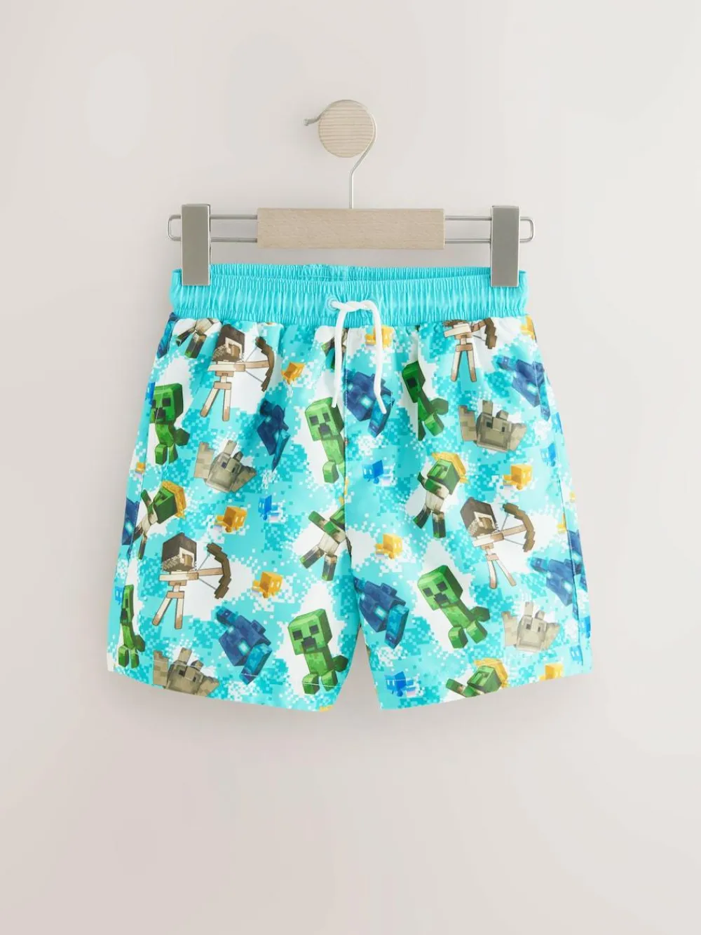 Get them ready for a holiday in the sun with these light blue swim shorts, featuring an officially licensed Minecraft all-over print. The swim shorts have an elasticated waistband with an adjustable drawstring, finished with pockets and a mesh lining. Swim shorts Minecraft print Elasticated waistband Adjustable drawstring Side pockets Machine washable. Main 100% Recycled polyester. Lining 100% Recycled polyester.