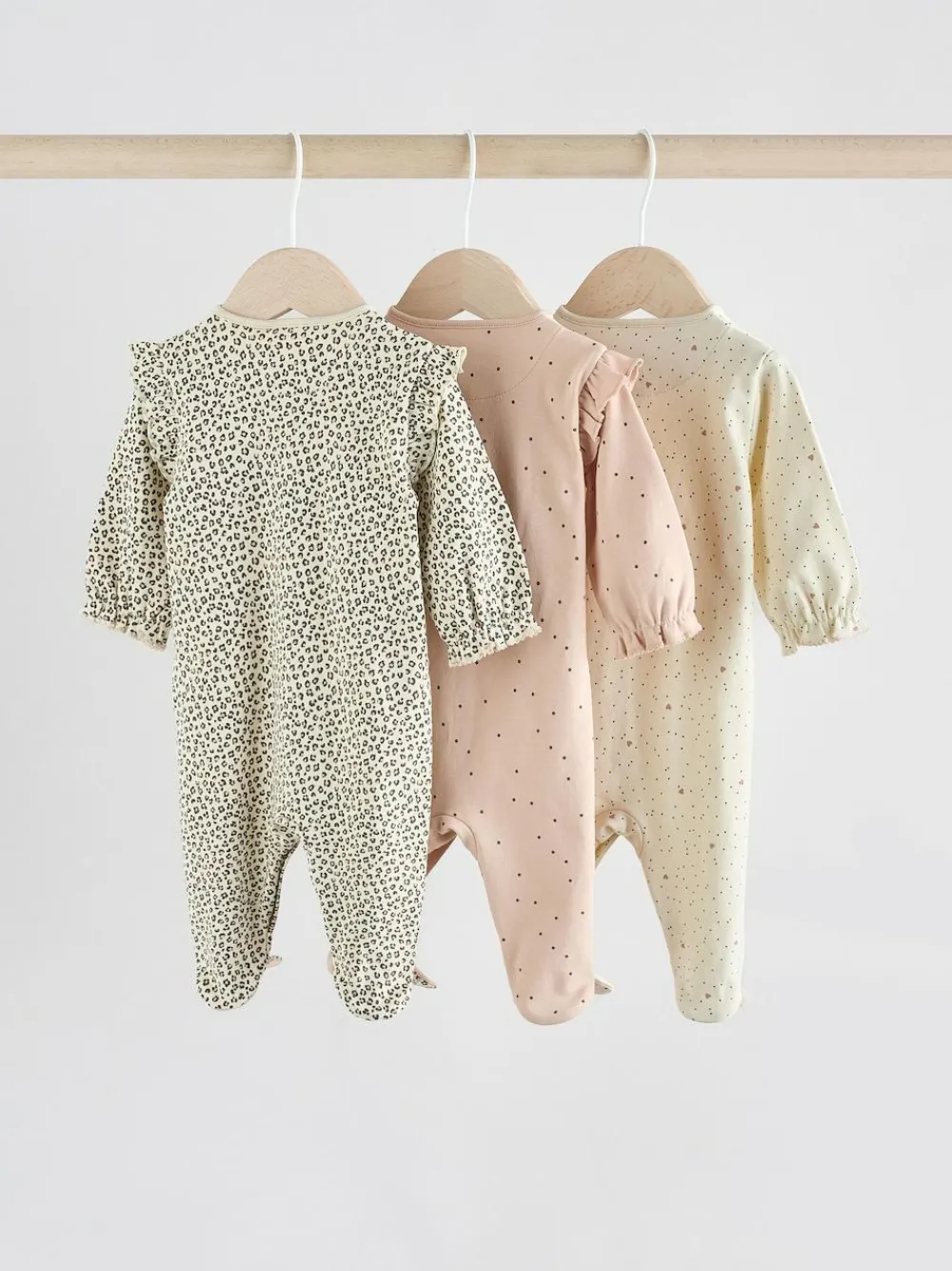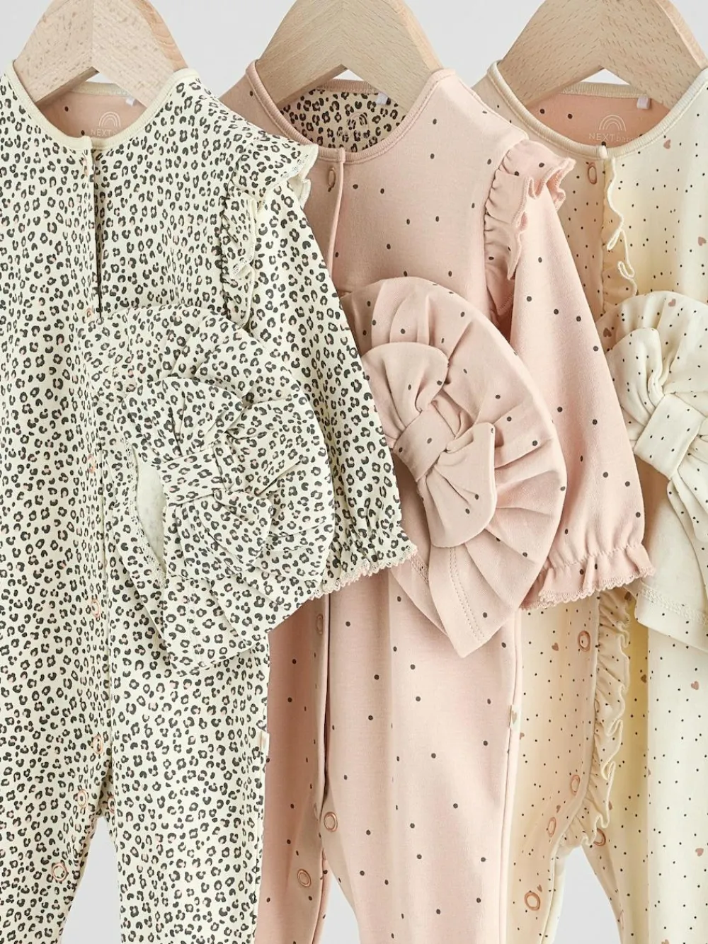 This adorable 3-pack of sleepsuits are made from pure cotton for a comfortable feeling, featuring animal, spot and spot and heart prints, each with a corresponding turban hat, finished with an oversized bow. Each sleepsuit has a popper fastening for easy changing, with turn back scratch mitts up to 3-6 months for extra comfort, inner lined feet and an anti-slip sole print from 9-12 months. 3-pack 100% cotton sleepsuits Matching turban hats Popper fastening Ruffle shoulders Machine washable. Sleepsuit, Sleepsuit, Sleepsuit, Hat, Hat and Hat 100% Cotton. Warning: Keep away from fire and flames.