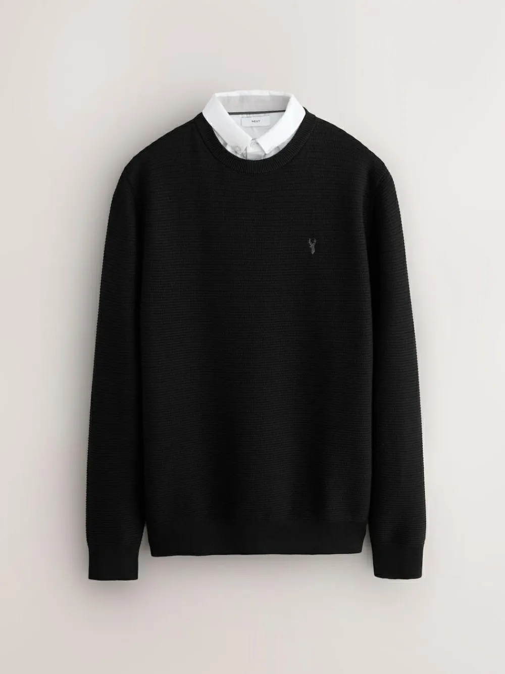Perfect for a smart-casual look, this crew-neck textured jumper in black is a versatile wardrobe staple. The comfortable, cotton-rich fabric provides all-day comfort, while the mock, white, Oxford shirt-collar detail offers the illusion of a layered look with minimal effort.Crew neck Cotton rich Oxford mock shirt detail Machine washable. Main 86% Cotton, 14% Nylon. Collar 100% Cotton.