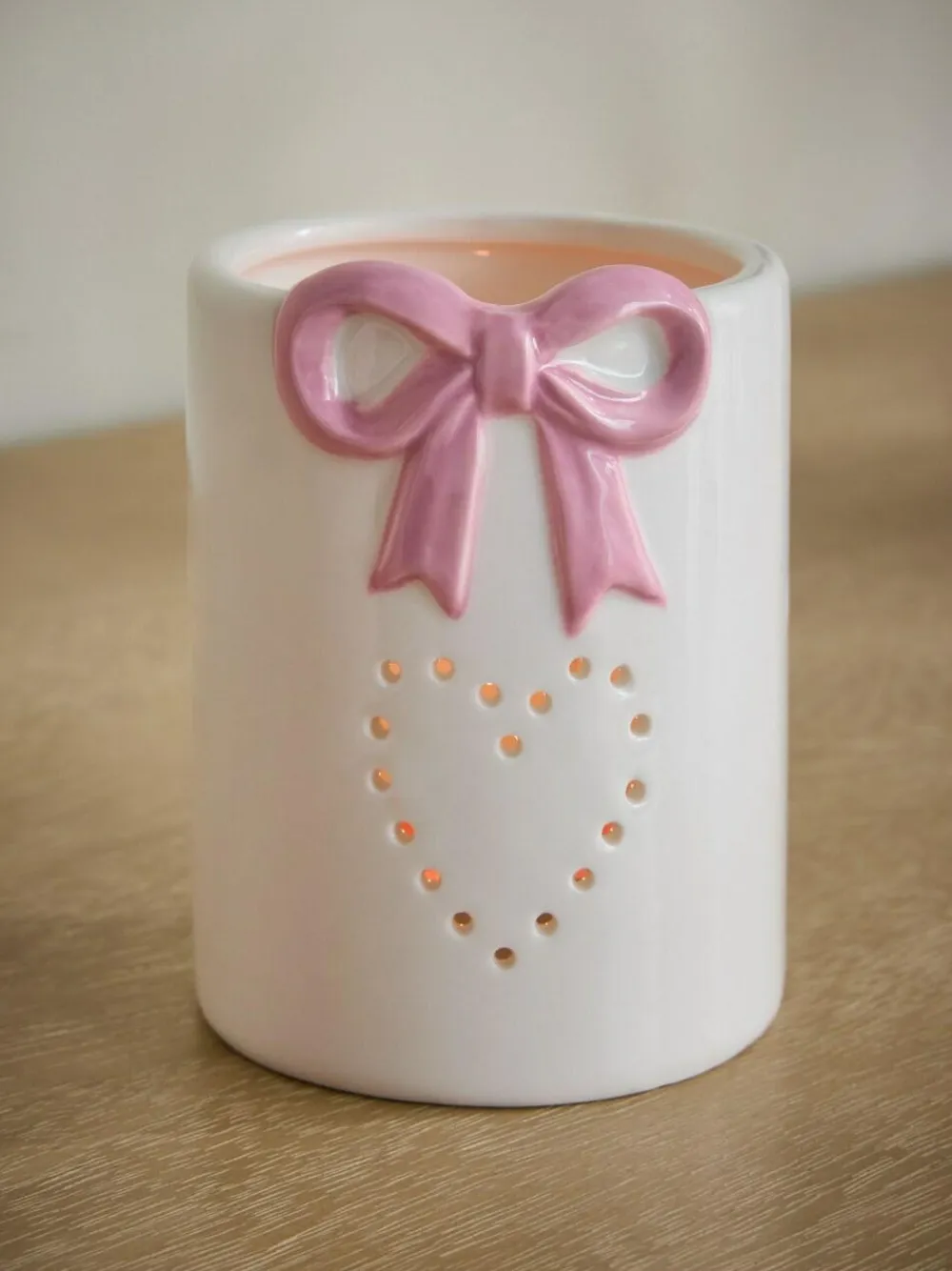 This adorable set of four tea light holders is perfect for adding a soft, romantic glow to any room. Crafted from ceramic, 2 have a beautiful pink-and-white ombre finish, 2 are a classic white, decorated with either a raised white or pink ceramic bow, adding a charming, three-dimensional detail. Cutouts are perforated into the lower section of each holder, allowing the light to peek through. This sweet and stylish set is ideal for creating a cozy, inviting atmosphere. Height 9cm Width 7cm Depth 7cm 100% Ceramic.