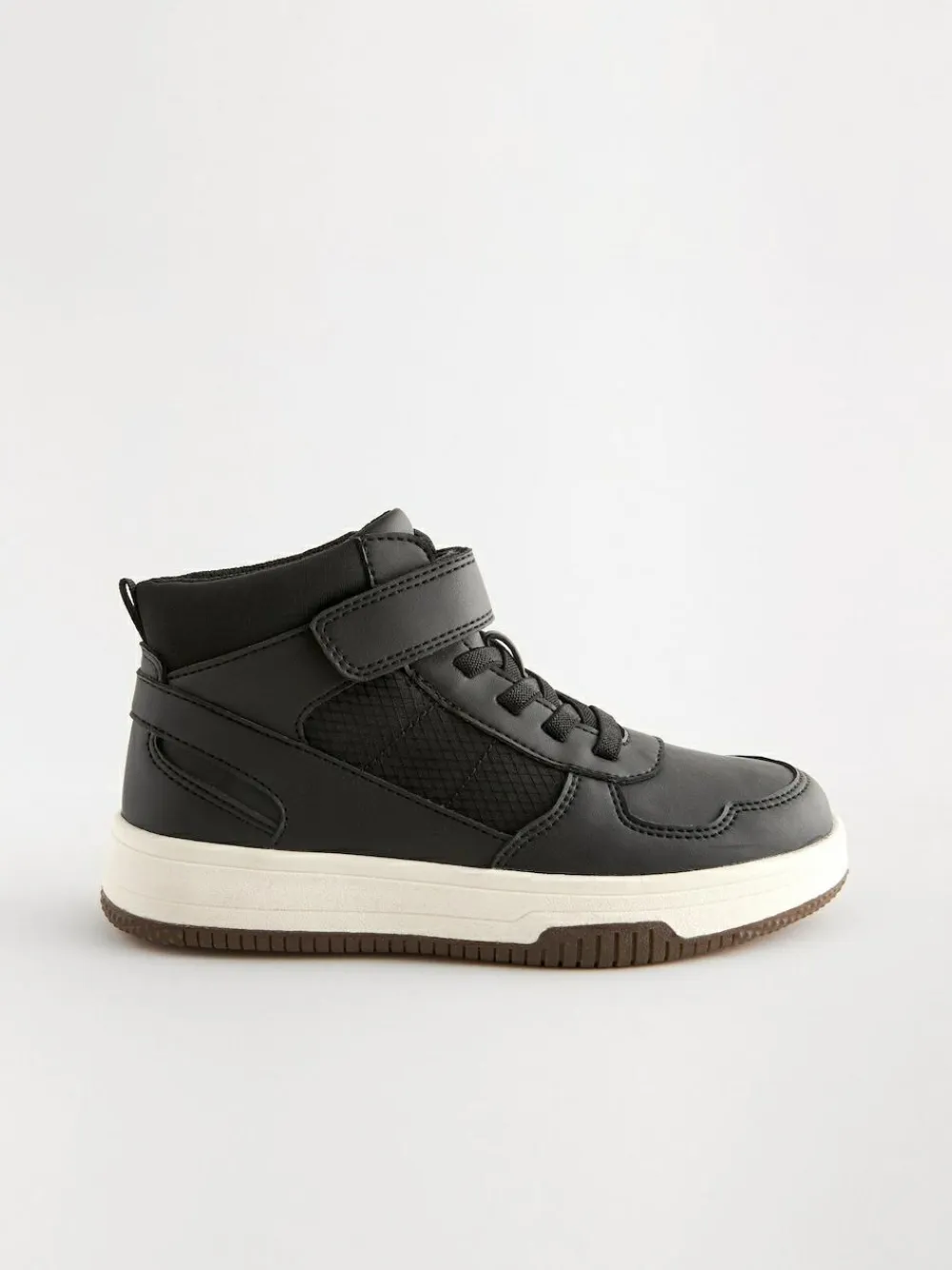 These sporty black high-top trainers have a versatile design that can be worn with smart-casual or everyday outfits, featuring a faux leather and textile upper with a lace-up and touch fastening. A textile lining keeps things breathable, finished with a durable and chunky outsole. High-top Lace-up and touch fastening Faux leather and textile upper Textile lining Durable outsole Upper – Other Materials, Textile, Lining & Sock – Textile, Sole – Other Materials.