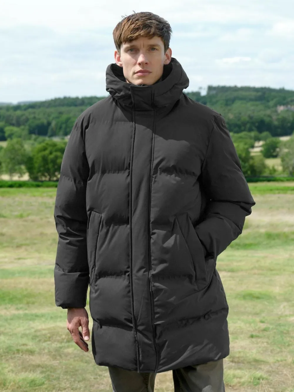 Battle the cold in this black, long-length puffer jacket, engineered for chilly conditions. The shower-resistant finish and cosy fleece lining provide ultimate warmth and comfort, while the waterproof centre zip and side pockets offer practicality. An adjustable bungee at the hem ensures a snug and stylish fit. Long-length Puffer jacket ThermoGen Shower-resistant with cosy fleece lining Waterproof centre zip and side pockets Adjustable bungee at hem Shell 100% Recycled polyester, Lining. and Wadding 100% Recycled polyester.