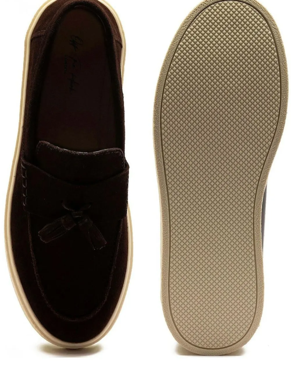 Classic charm meets casual ease in the Rory tassel loafers. Made in rich brown suede, they combine easy slip-on comfort with traditional flair—perfect for weekend outings or laid-back office wear.. Slip-on design with front tassels. Soft brown suede upper. Moc toe stitching for timeless appeal. Lightweight, off-white textured sole. Cushioned insole for added comfort. Put your best foot forward—Rory makes everyday style effortless. Main – 100% Leather. Lining – 100% Other fibres. Sock – 100% Other fibres.