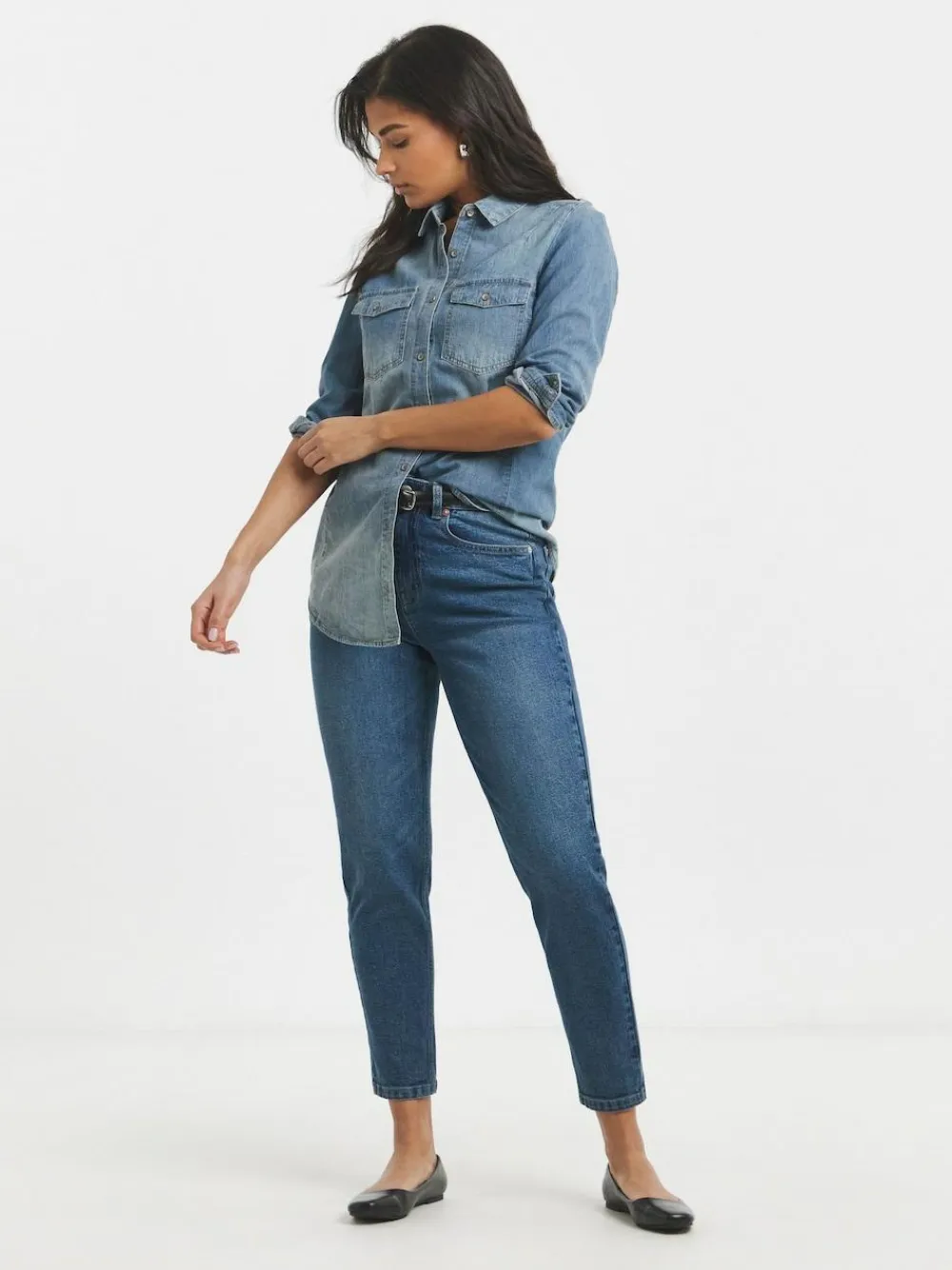 Our Loose Mom Jeans are a wardrobe staple this season! They feature a mid-blue wash, belt loops, front and back pockets, and a flattering mom shape. Style with trainers and a tee for a daytime look. Machine washable. 99% Cotton, 1% Elastane.