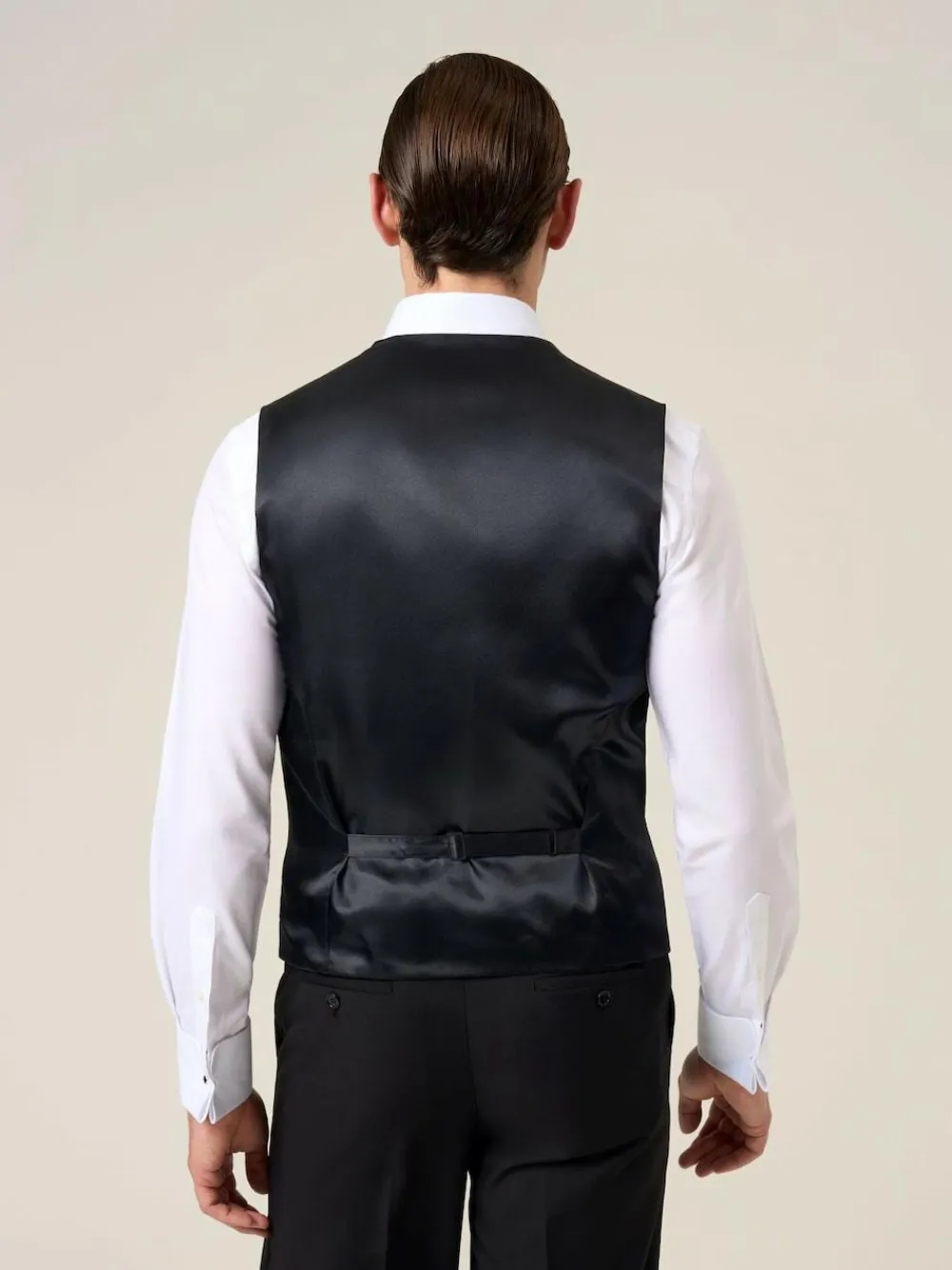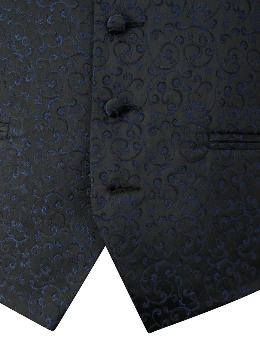 Fancy party wear waistcoat in black and Navy blue paisley fabric. The perfect piece to elevate a black tie look. Features include five button single breasted fastening, lower waist jetted pockets, cloth covered buttons, tonal plain lining with adjustable back strap. Dry clean only. 100% Polyester.