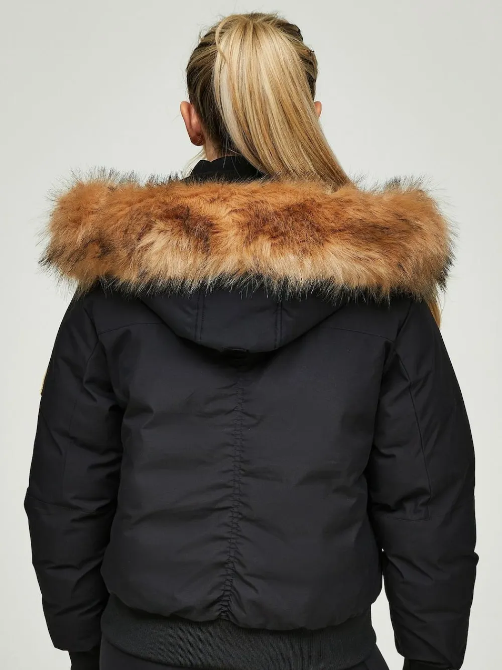 Keep the cold out with this women s Olivia Asphalt Bomber Jacket from Zavetti Canada. This cropped jacket has a full zip front and a popper fastening flap that extends up the chin. The stretchy ribbed trims shape the fit, and the fluffy faux fur trim hood is removable so you can pick and choose the times to unleash it. Finished off with multiple pockets and signature Zavetti Canada branding. Machine washable. 100% Cotton.