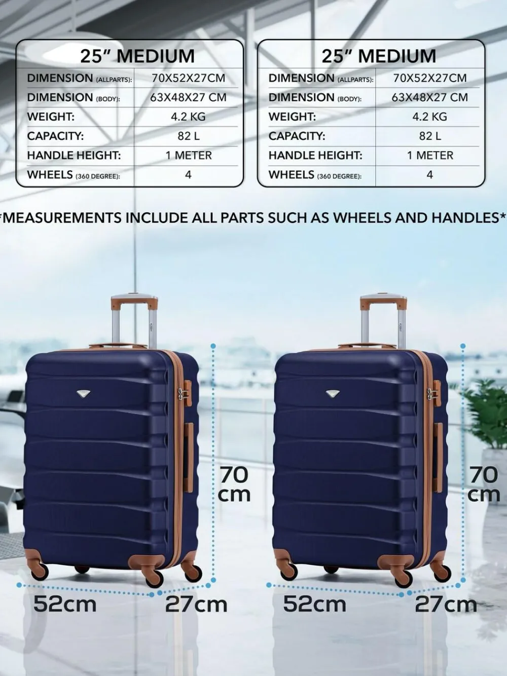 Medium 25 Dimensions: 70x52x27cm (All Parts), 63x48x27cm (Body), Weight: 4.2Kg, Capacity: 82L. Whenever and wherever you travel we know your luggage and contents are precious to you. The rugged anti-scratch water resistant hard outer shell of this suitcase is made from strong and durable ABS to withstand the rigours of modern transport and airline handling protecting your contents during your travels. This Medium suitcase has a secure 3 digit combination lock and the adjustable push button 3-step telescoping handle system offers effortless movement during travel. The fully lined interior and the multi-use organizational pockets make packing clothes easy. 4 wheel design for full 360 degree manoeuvrability tested extensively on different surfaces and conditions to ensure endurance and strength. Available in a variety of colours and size combinations so you can make the perfect purchase for your next trip by plane, train, vessel, coach or car. Height 70cm Width 52cm Depth 27cm 0% ABS (Acrylonitrile Butadiene Styrene).