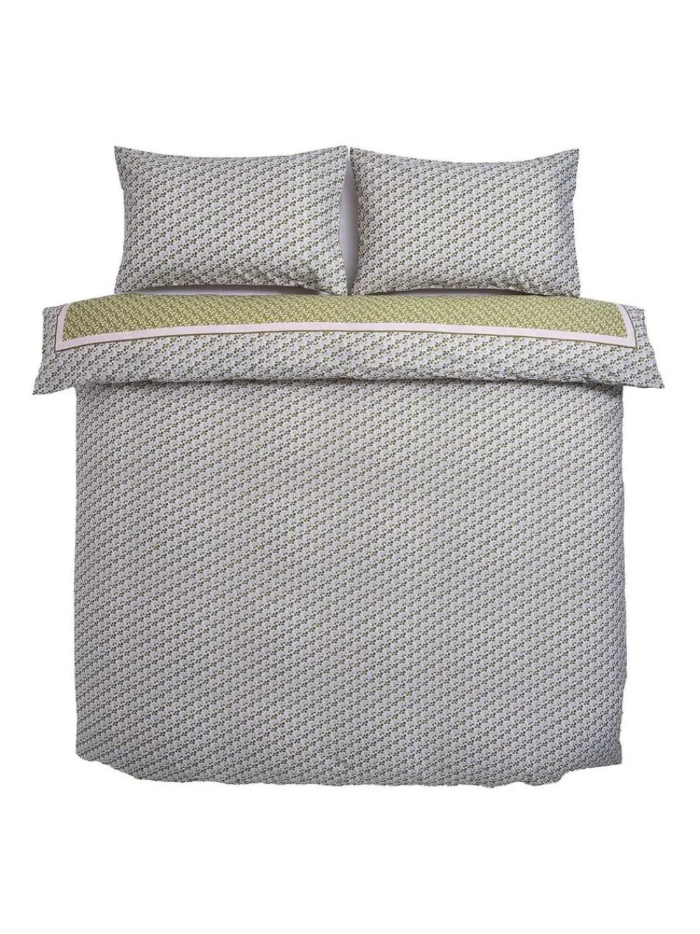 Brighten your bedroom with the charming Cath Kidston Green Scarf 180 Thread Count Duvet Cover and Pillowcase Set. This versatile set is fully reversible, offering two distinctive looks. Both sides feature a subtle, delicate green patterned motif, accented with cheerful pink trim along the edges of the pillowcases and the border of the main duvet cover design. Crafted from comfortable 180 thread count cotton fabric, this set provides a fresh, cosy and flexible foundation for your bedding. 180 thread count Reversible Green scarf print Machine washable. Duvet Cover and Pillowcase:100% Cotton