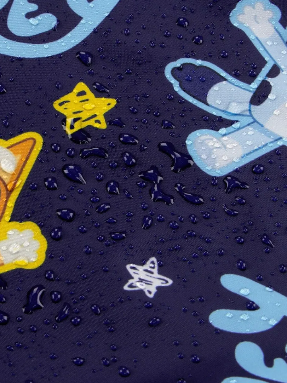 Designed with a fun all-over Bluey and Bingo pattern, this kids puddle suit is a must-have for little adventurers. kids splash suit is lined with soft, warm material, it keeps your child snug while they splash and play. Let your little one dive into puddle-jumping adventures with this adorable navy rain suit featuring Bluey, Bingo, and a playful sprinkle of multicoloured stars. Its cosy lining ensures warmth and comfort, while the vibrant design adds a touch of joy to rainy days. Perfect for outdoor escapades, this boys puddle suit is as practical as it is delightful. Get ready for hours of fun-filled splashes! Machine washable. 100% Polyester.