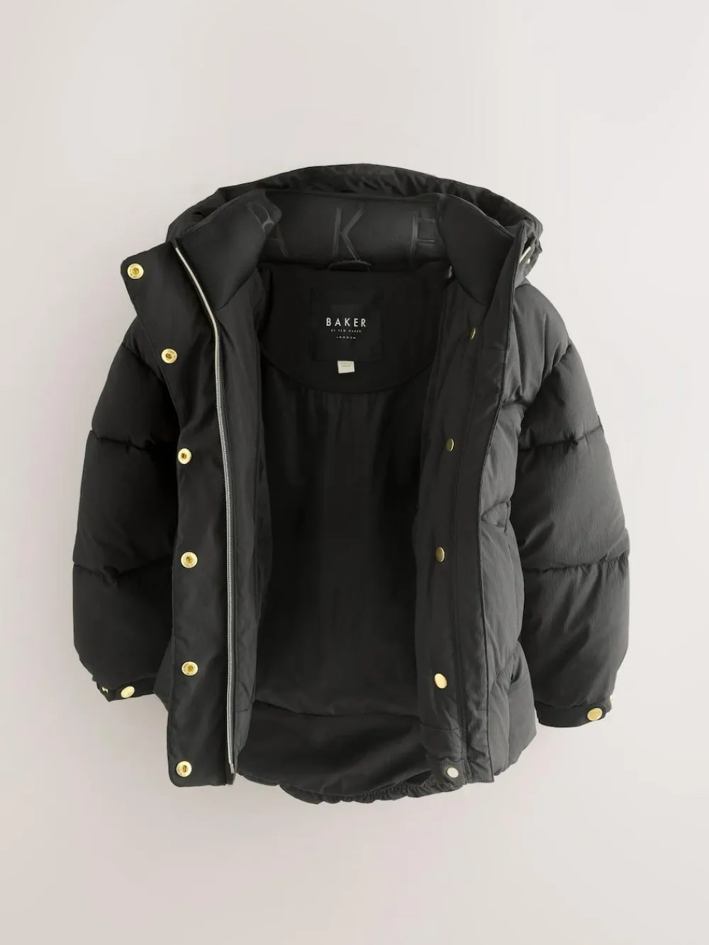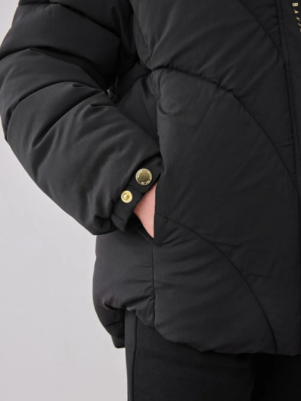 Wrap her up warm in style this season in this Baker by Ted Baker short padded coat. Padded for extra warmth, this coat features a zip fastening down the front, followed by gold branded poppers down the centre and on the sleeve cuffs. The coat is beautifully complimented with gold foil print Baker branding along the zip placket, and back of the hood. Details include a branded badge on the arm and an internal pocket. She’ll be ready for day whatever the weather! Shell 95% Nylon, 5% Elastane. Lining 100% Polyester. Collar 94% Polyester, 6% Elastane. Wadding 100% Polyester. Shower resistant, water repellent finish to provide protection against light rain.