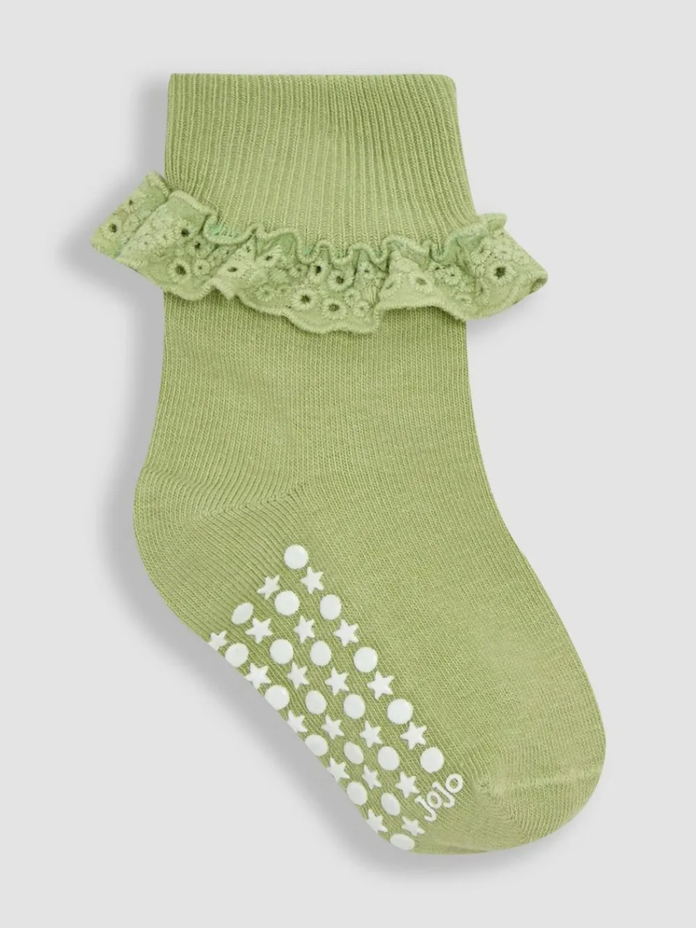 Dainty frills, 1, 2, 3… slip on some snug socks and dance happily! These socks are featured in green, white, and pink, complete with anti-slip soles so that your little one can toddle and tread around as they please. And with a pack of 3, it s always handy to have spares. Pack of 3 Anti-slip sole Supersoft touch Frill details Machine washable Use a delicate setting Do not tumble dry Do not iron Do not dry-clean 78% Cotton, 20% Nylon, 2% Elastane.