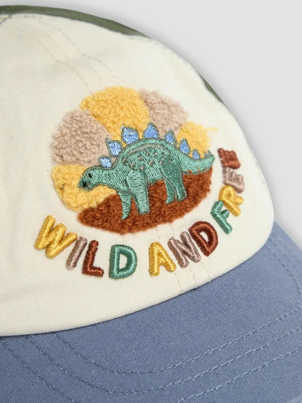 Rumble, roar, let’s explore! Finish off any sun-safe look with this comfy colour-block cap, made to protect little heads from harmful UV rays while being a super fun accessory. The playful dinosaur appliqué makes this a must-have accessory that little ones will love, with a practical rip-stop strap that is adjustable at the back so that your little explorer can play all day in carefree comfort. Colour block cap Dino print Holes for ventilation Rip the stop strap to adjust Hand Wash only Main 100% Cotton. Lining 100% Cotton.