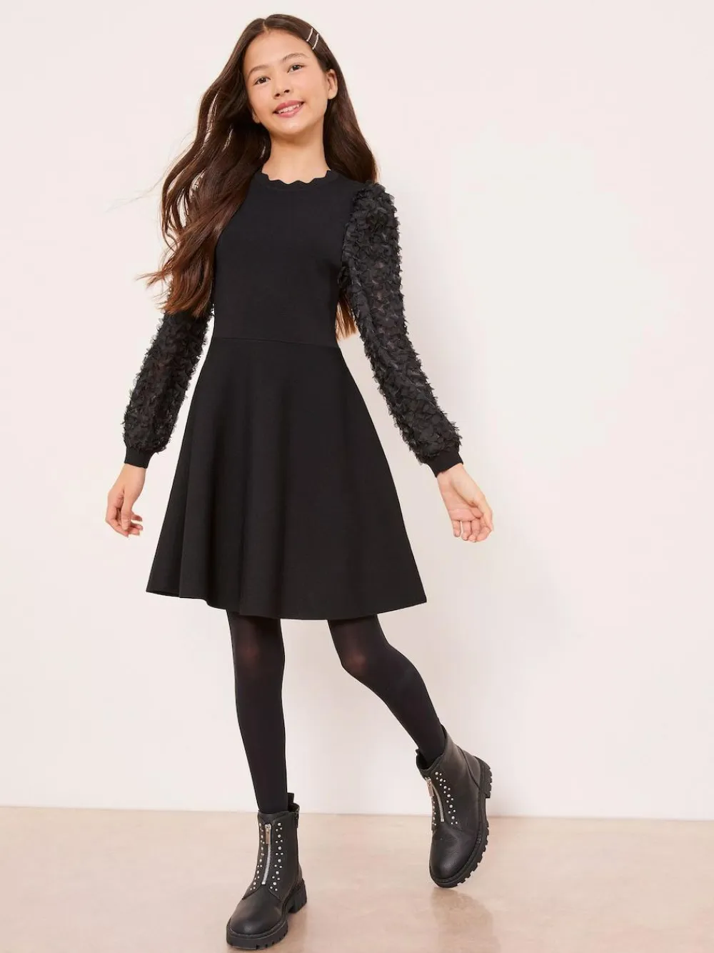 Elevate her style with this elegant dress from Lipsy Girl, perfect for special occasions and everyday wear. Featuring a classic fit and flare silhouette, this dress offers a comfortable fit. The standout detail is the sheer long sleeves adorned with delicate 3D detail, adding a touch of sophistication and charm. Crafted from a soft fabric, it ensures all day comfort and durability. The subtle scalloped neckline completes the refined look. Ideal for parties, family gatherings, or celebrations, this dress combines timeless elegance with modern flair. Main 48% Polyester, 31% Viscose, 21% Nylon. Sleeves 100% Polyester.