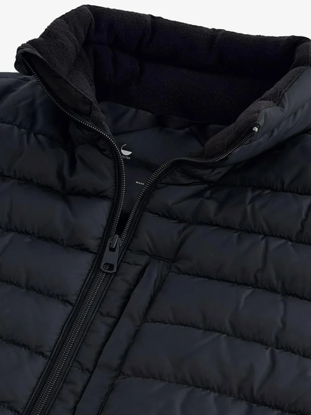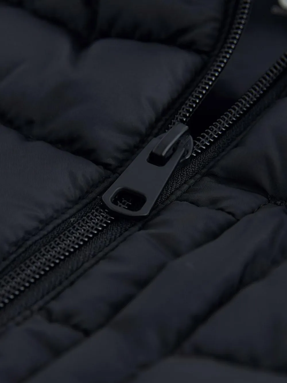 Our lightweight puffer gilet in black is perfect as a mid-layer, with a warm quilted construction, a full zip fastening and hood. The perfect transitional layer. Puffer gilet Lightweight fabric Hooded Zip through front Main 100% Recycled polyester. Lining 100% Recycled polyester.