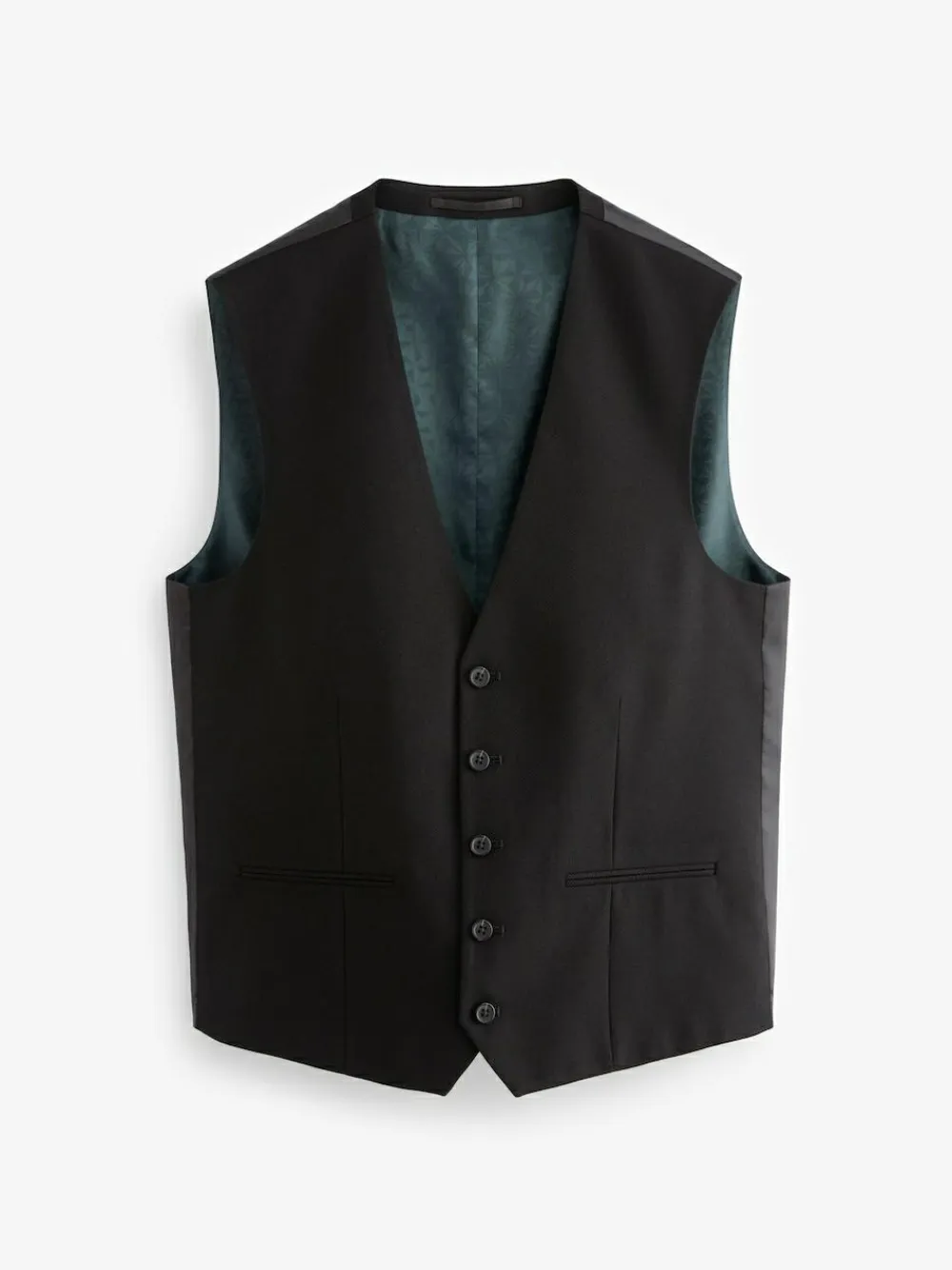 The perfect mid-layer for your suited look, this black waistcoat features a single-breasted button-up fastening, with an adjustable back strap and a printed lining. Regular fit Single breasted 5-button fastening Adjustable back strap Main 62% Recycled polyester, 35% Viscose, 3% Polyester. Inner Lining 100% Recycled polyester. Outer Lining 100% Recycled polyester.