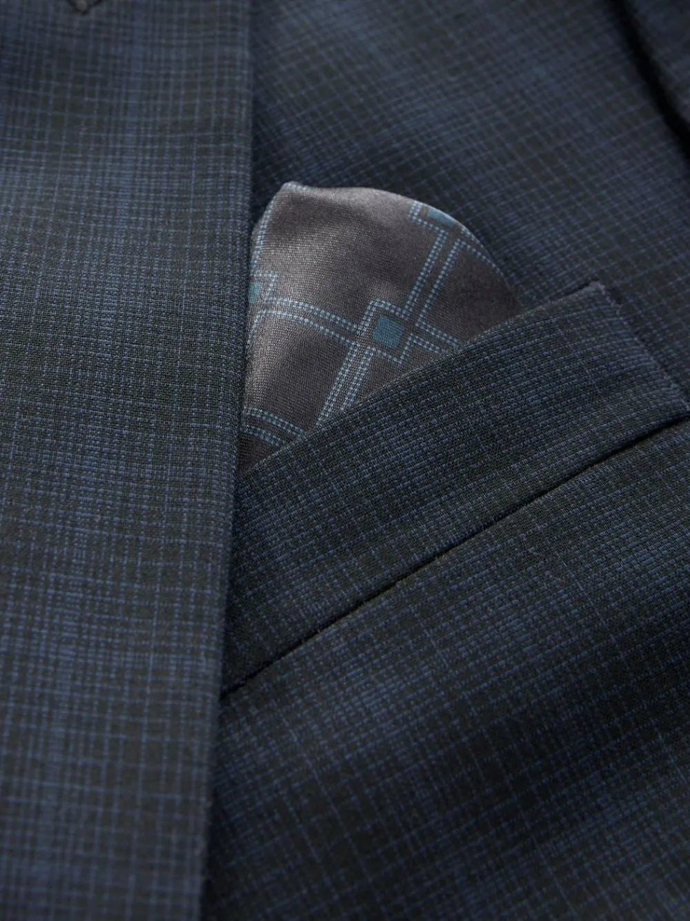 Achieve a sleek silhouette with this slim-fit, navy suit jacket. Its four-way stretch fabric ensures comfort and flexibility, while the classic check pattern and full lining provide a polished finish. With a pull-out pocket square and internal pockets, this jacket is both stylish and practical. Four-way stretch Slim fit Internal pockets Fully lined Two-button fastening Pull-out pocket square Check out The Suit Shop for more inspiration: https://www.next.co.uk/men/the-suit-shop Main 67% Recycled polyester, 29% Viscose, 4% Elastane. Lining 100% Recycled polyester.