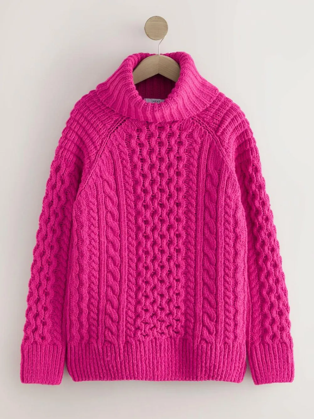 Clearance Next Roll Neck Cable Longline Jumper with Wool Bright Pink