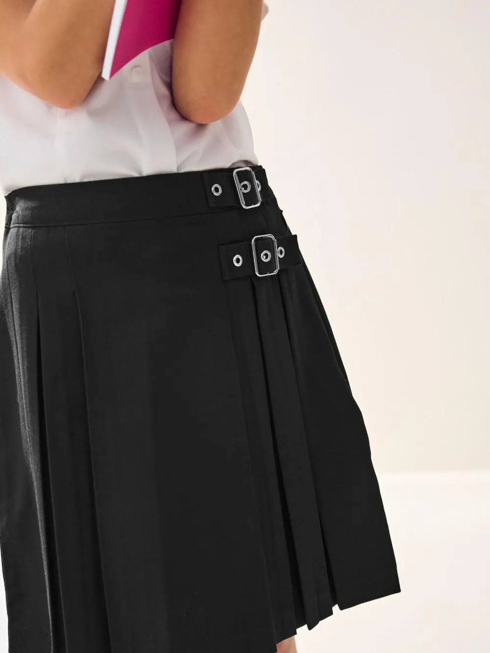 Give them some variation in their schoolwear with our black kilt-style skirt. This stylish kilt-style skirt features a side opening and silver buckle detailing. With a longer length, this skirt is perfect for pairing with socks or tights. Key features Easy Iron Fabric – Handy easy-iron finish Teflon® Technology – Teflon EcoElite™ is a non-fluorinated plant-based finish that repels water and water-based stains for easy cleaning and quick drying. Visit www.teflon.com/ecoelite for more information Machine washable Adjustable waist Silver buckle detailing Side zip opening Longer length Machine washable. 65% Recycled polyester, 35% LENZING™ ECOVERO™ Viscose. This product is made with teflon. Teflon® is a registered trademark of DuPont.