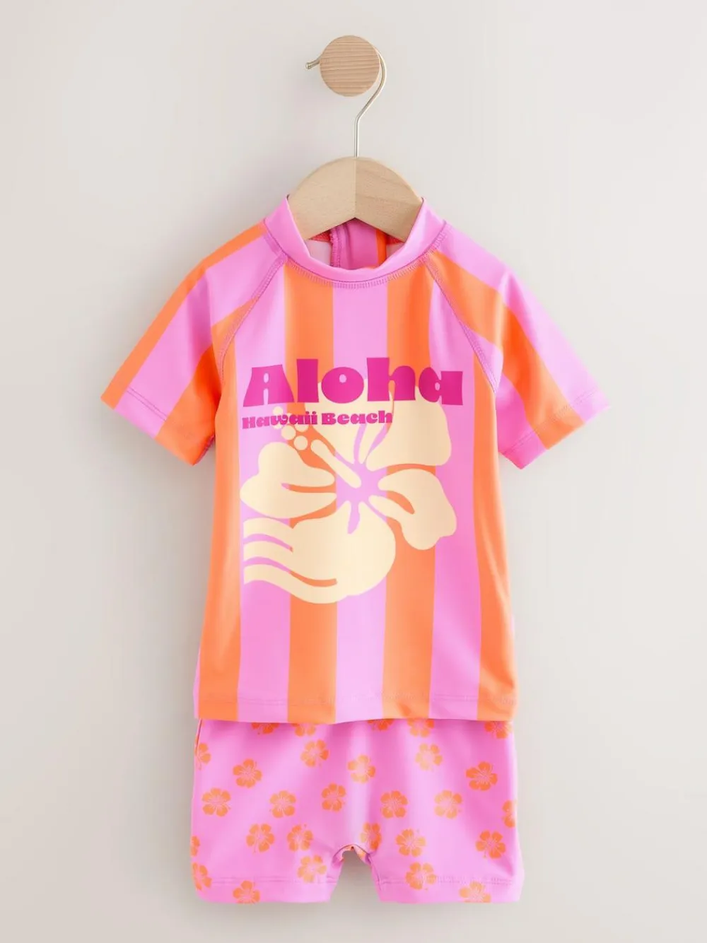 They’ll be protected and stylish in this vibrant pink and orange hibiscus print swim set, which is perfect for holiday sun. The set is made from a lightweight swimsuit fabric that offers a high UPF rating 50+ for superior sun protection. For easy dressing, the top features a zip fastening at the back (up to 12-18 months). Swimsuit fabric UPF rating 50+ Zip fastening at back up to 12-18 months Perfect for holiday Short-sleeved top and matching shorts All-over print Machine washable. Sunsafe Top 82% Recycled polyester, 18% Elastane. Swim Short Main 82% Recycled polyester, 18% Elastane. Lining 92% Recycled polyester, 8% Elastane. This fabric will provide protection against solar ultraviolet radiation. It has been independently tested and given a UPF rating of 50+ which blocks more than 97.5% of UV rays. Important Advice: • Sun exposure causes skin damage • Only covered areas are protected • Always use a high protection factor sunscreen on any exposed areas of skin • The protection offered by this fabric may be reduced with use or if stretched or wet • Always rinse in fresh water after each use • Young children should be kept in the shade between 11 and 3 • Don’t forget your hat and sunglasses. • Fabric provides UVA +UVB protection from the sun.