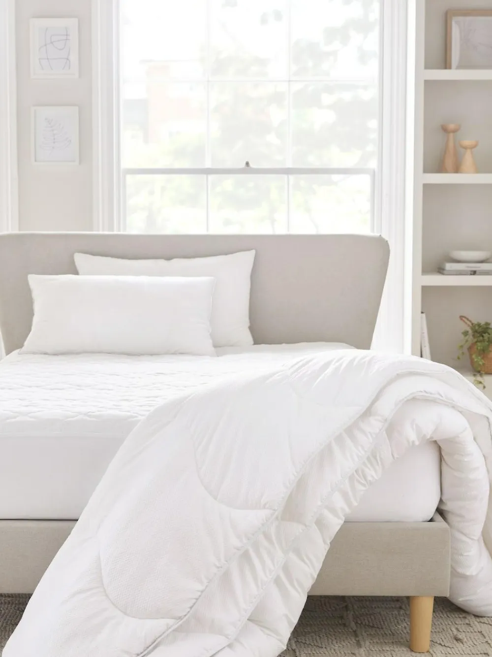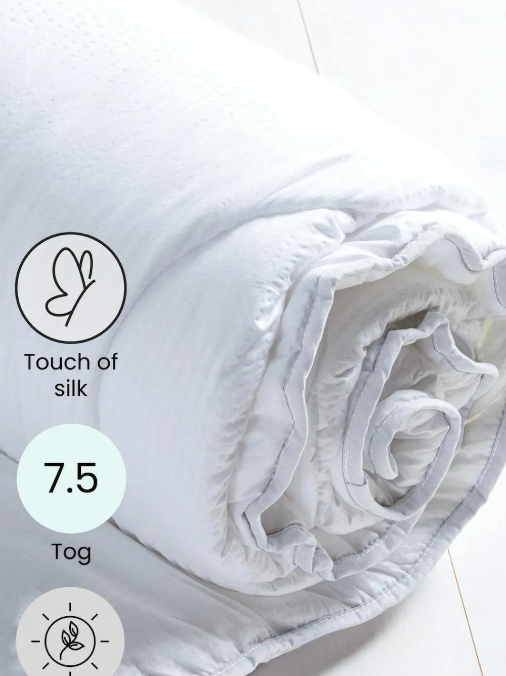 Sleep In Silk Range Immerse yourself in sleep with our touch of silk duvet, offering the ideal mix of comfort with a lightweight feel. With a hint of natural silk blended in, this duvet is as soft as a cloud, and its seersucker detail adds an extra point of interest to your bedding. Available in a range of togs to suit your needs. Key Features: 7.5 Tog Duvet Silk Feel Product Dimensions: Single: 135 x 200cm Double: 200 x 200cm King: 230 x 220cm Superking: 260 x 220cm Tog ratings: 3 Tog: Suitable for warm summer nights 4.5 Tog: Suitable for summer nights 7.5 Tog: Suitable for spring & summer 10.5 Tog: Suitable for all year round 13.5 Tog: Suitable for cold winter nights 15 Tog: Suitable for cold winter nights For top tips on choosing the best duvets and pillows for you read our handy guide here. Machine washable. Cover 100% Recycled polyester. Filling 95% Recycled polyester, 5% Silk.
