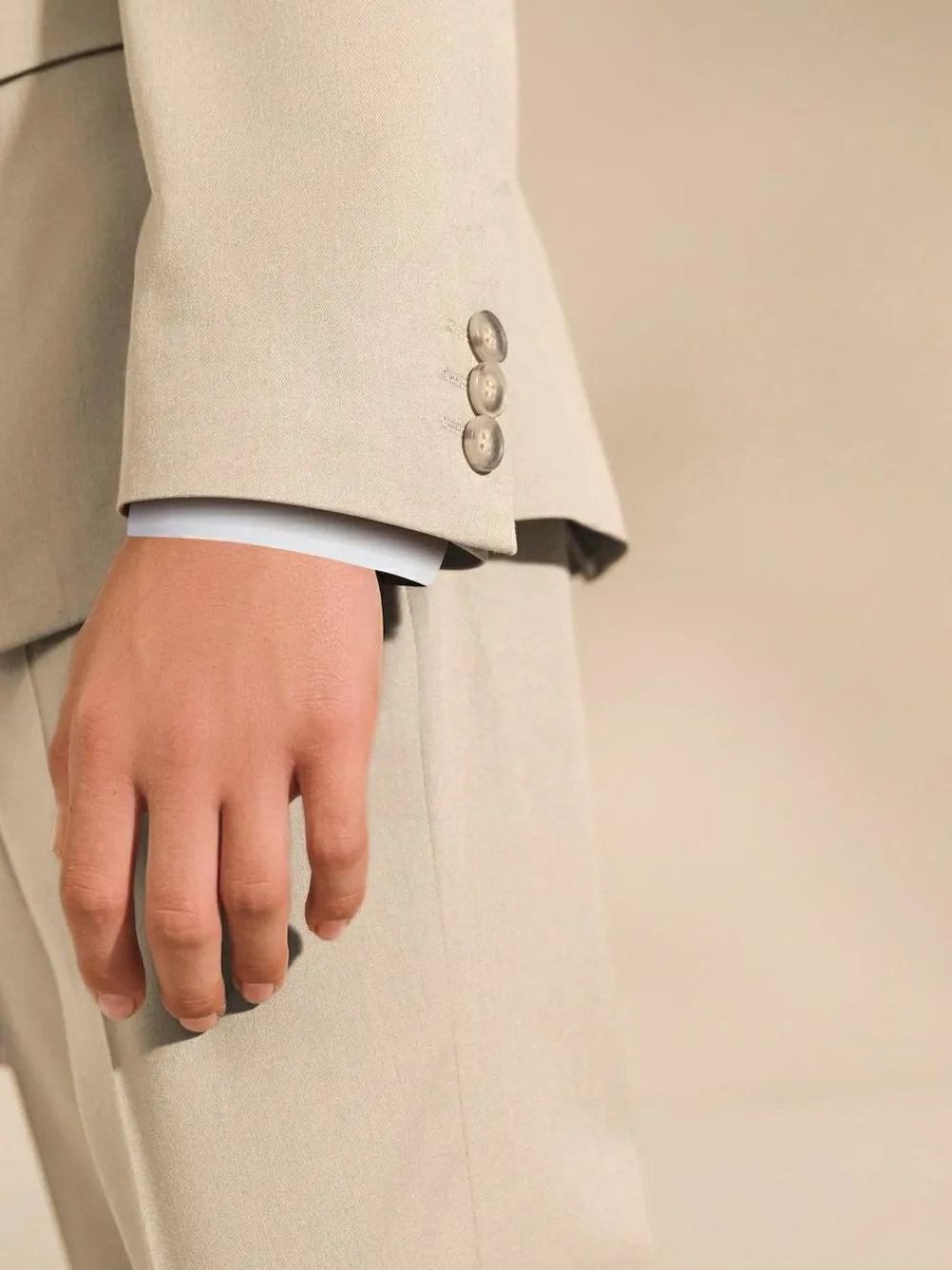 He’ll look smart and stylish in this classic tan brown suit jacket, featuring a single-breasted button-down fastening, a notched lapel collar, flap pockets and a chest pocket to the front, finished with a button cuff and a printed lining. Single-breasted Button-down fastening Lapel collar Flap pockets Chest pocket Machine washable. Main 64% Polyester, 34% Viscose, 2% Elastane. Lining 50% Recycled polyester, 50% Polyester.