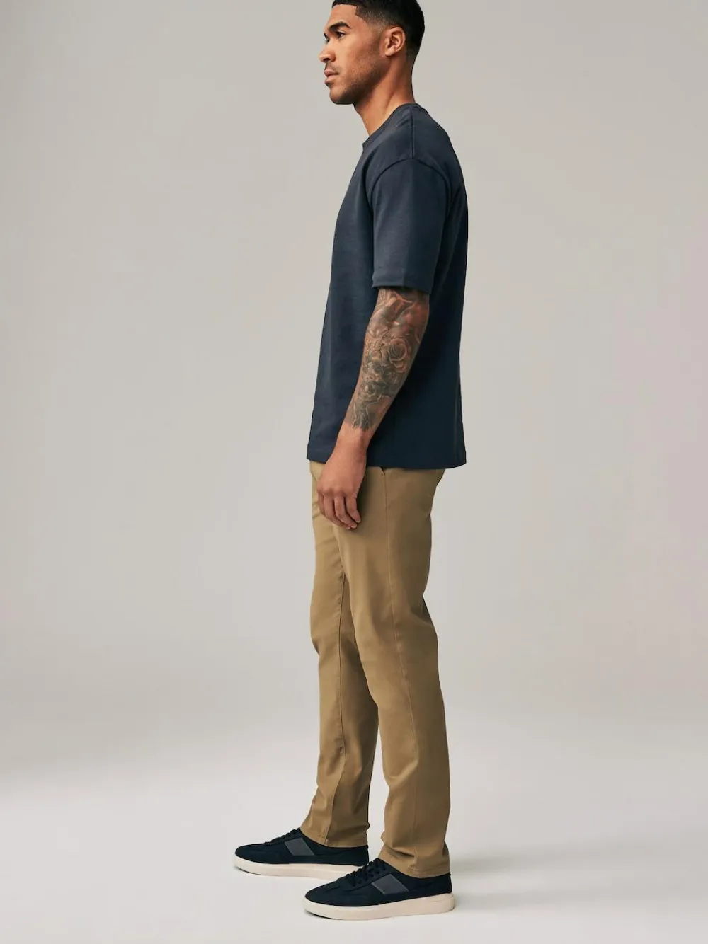 This easy-to-style chino trouser is a wardrobe classic you’ll reach for on repeat. Designed in a stretch cotton fabric for all-day comfort, the relaxed chino silhouette can be dressed up just as easily as it can be dressed down. Style with a classic tee and box-fresh trainers for effortless cool Cotton-rich Stretch fabric Classic chinos Side pockets Button and zip fastening Machine washable. 98% Cotton, 2% Elastane.