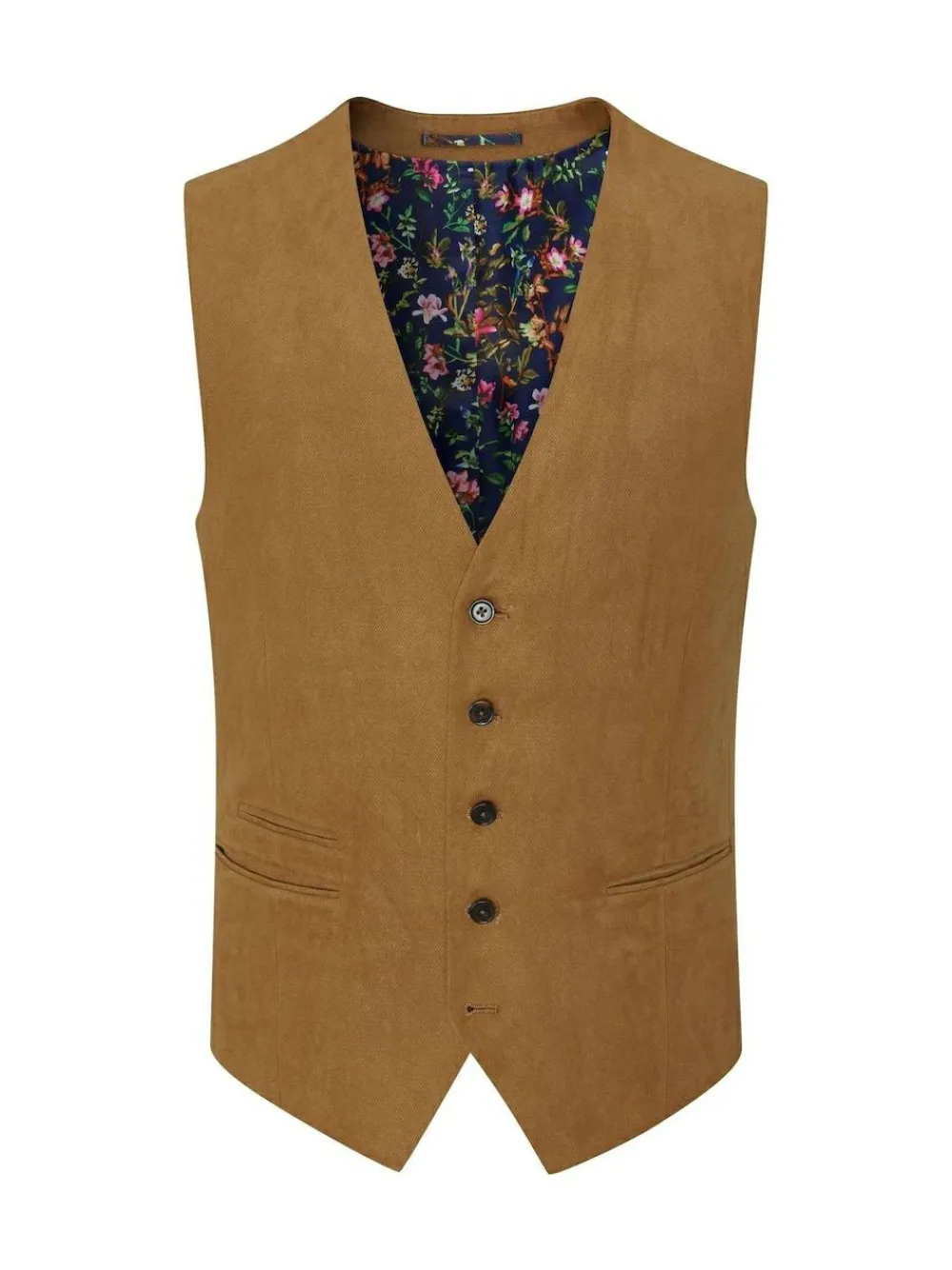 I’m Camplin, a single-breasted waistcoat cut from a corn suede cloth. Together with my adjustable back straps and jetted pockets, I’m just the ticket for channelling that classic countryside look. Take a look at my floral print lining too – I’d say it’s the cherry on top. Camplin single-breasted five-button fastening waistcoat in corn fabric. Features include lower waist jetted pockets, a jetted ticket pocket, floral print lining and an adjustable back strap. Dry clean only. 100% Polyester.