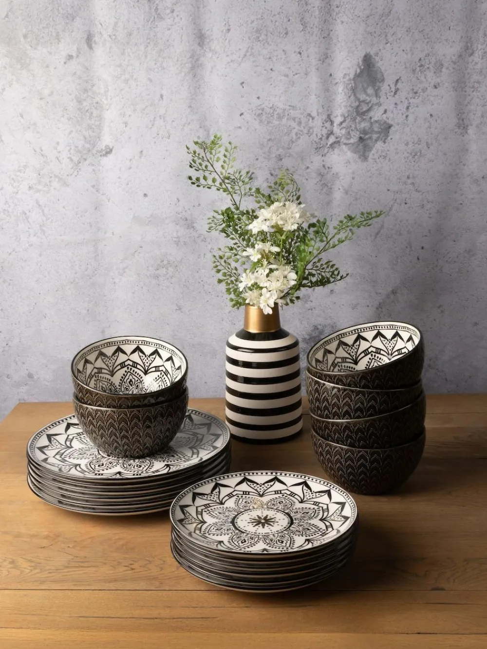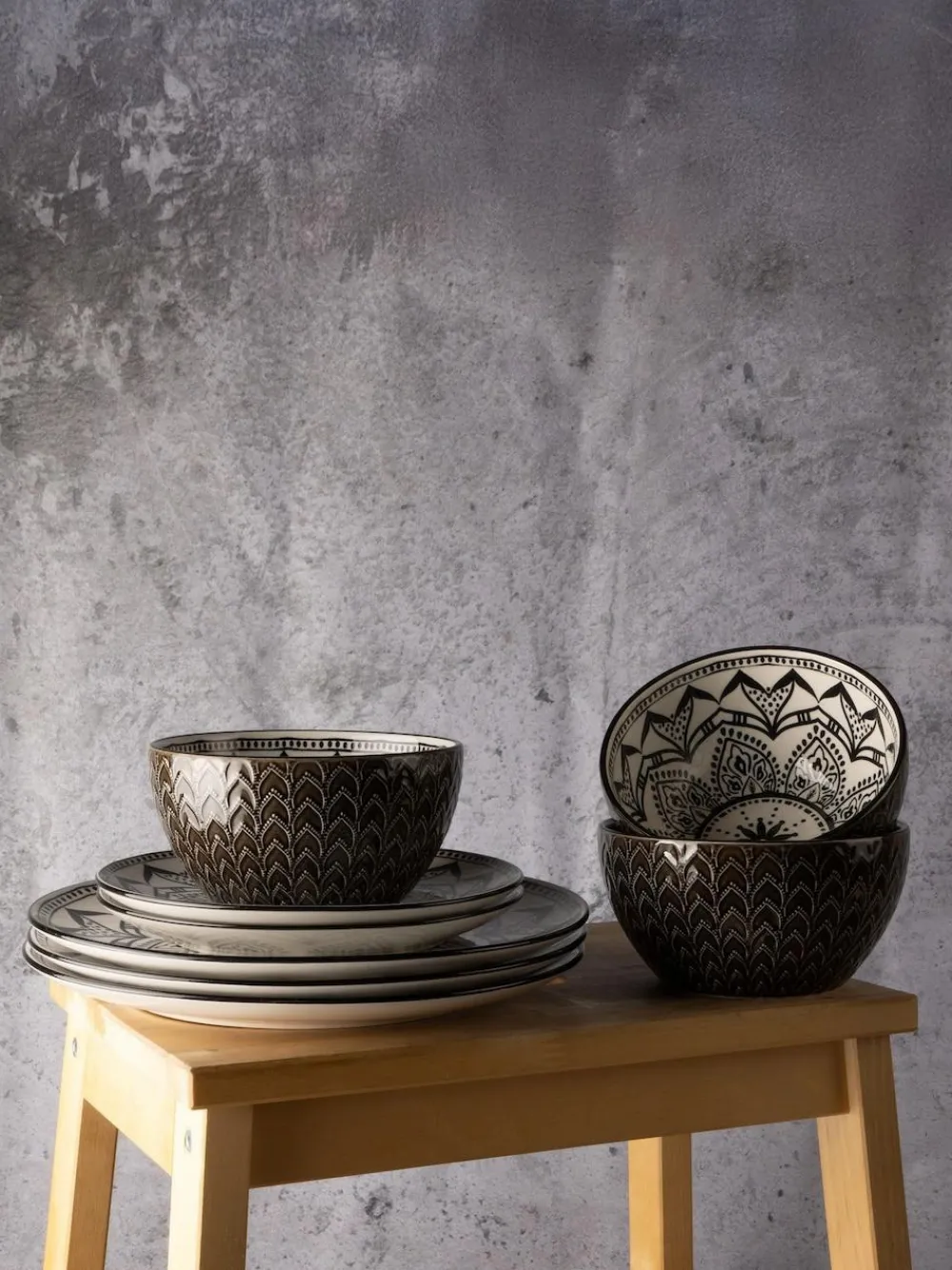 Bring a touch of style to your table with this beautifully patterned 12-piece dinner set, inspired by traditional Moroccan tilework. Featuring intricate designs in beige and black, this set of 6x Dinner Plates, 6x Dessert Plates & 6x Bowls will add artisan charm to every meal. Dinner Plate Diameter 26.5 cm Side Plate Diameter 20 cm Bowl Depth 15cm Height 32cm Width 47cm Depth 20cm D/Wash and M/W safe. 100% Ceramic.